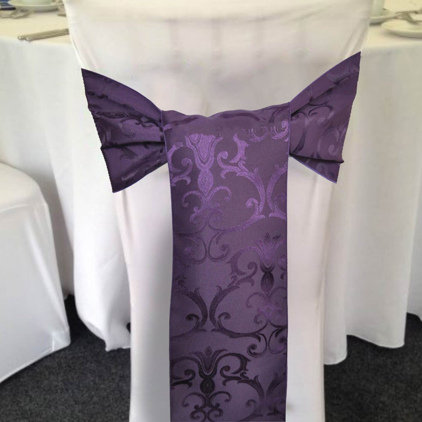 10 Pieces Eggplant Damask Jacquard Chair Sashes, 7.5"x108" Elegant Versailles Pattern Polyester Decor