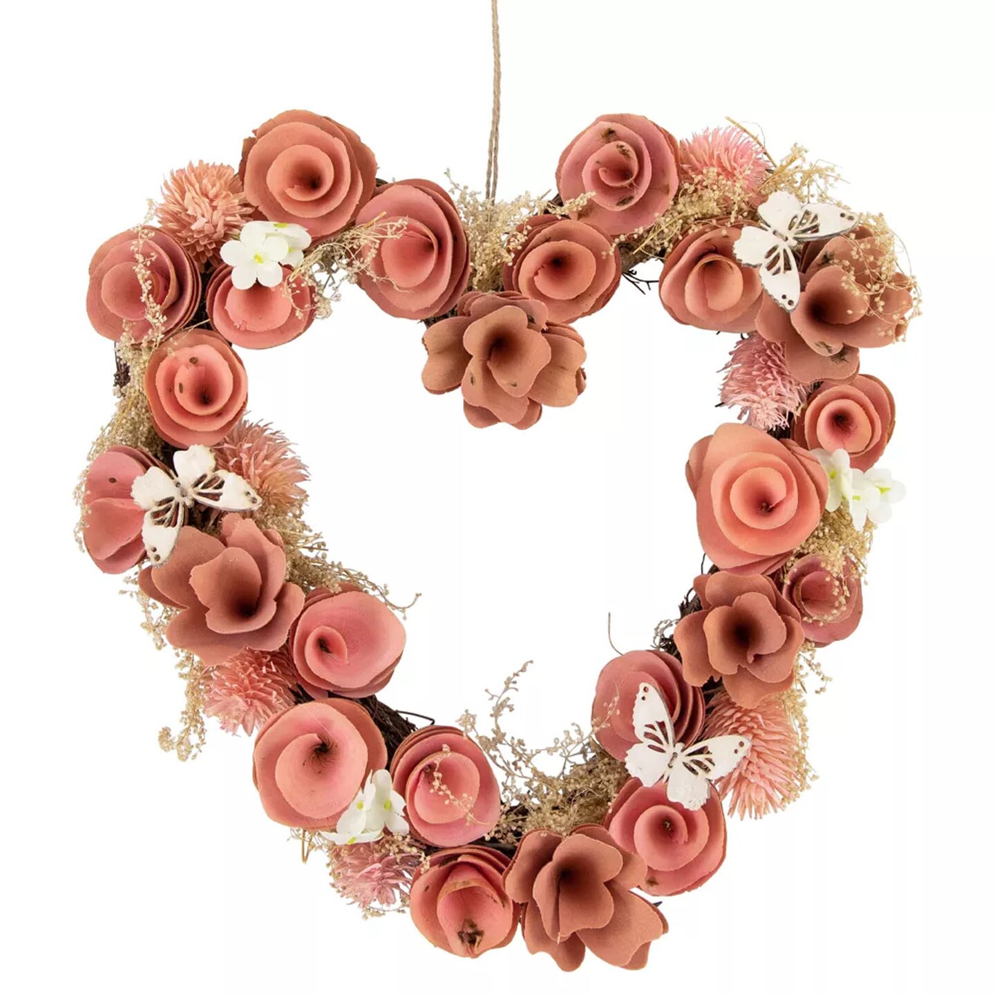10" Pink Wooden Heart Wreath with Roses and Butterflies Spring Floral Wall Decor