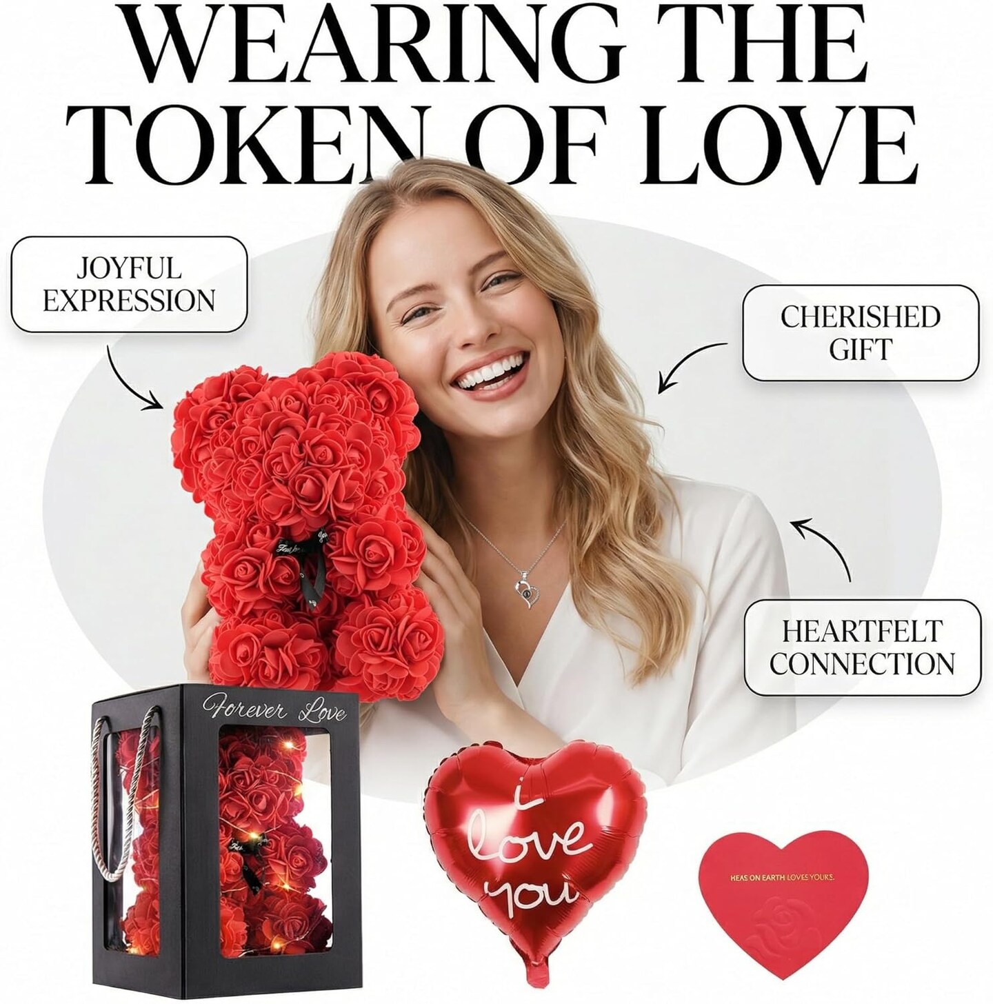 10” Red Rose Bear Teddy Bear with Lights Gift Set – I Love You Necklace, Card & Balloon