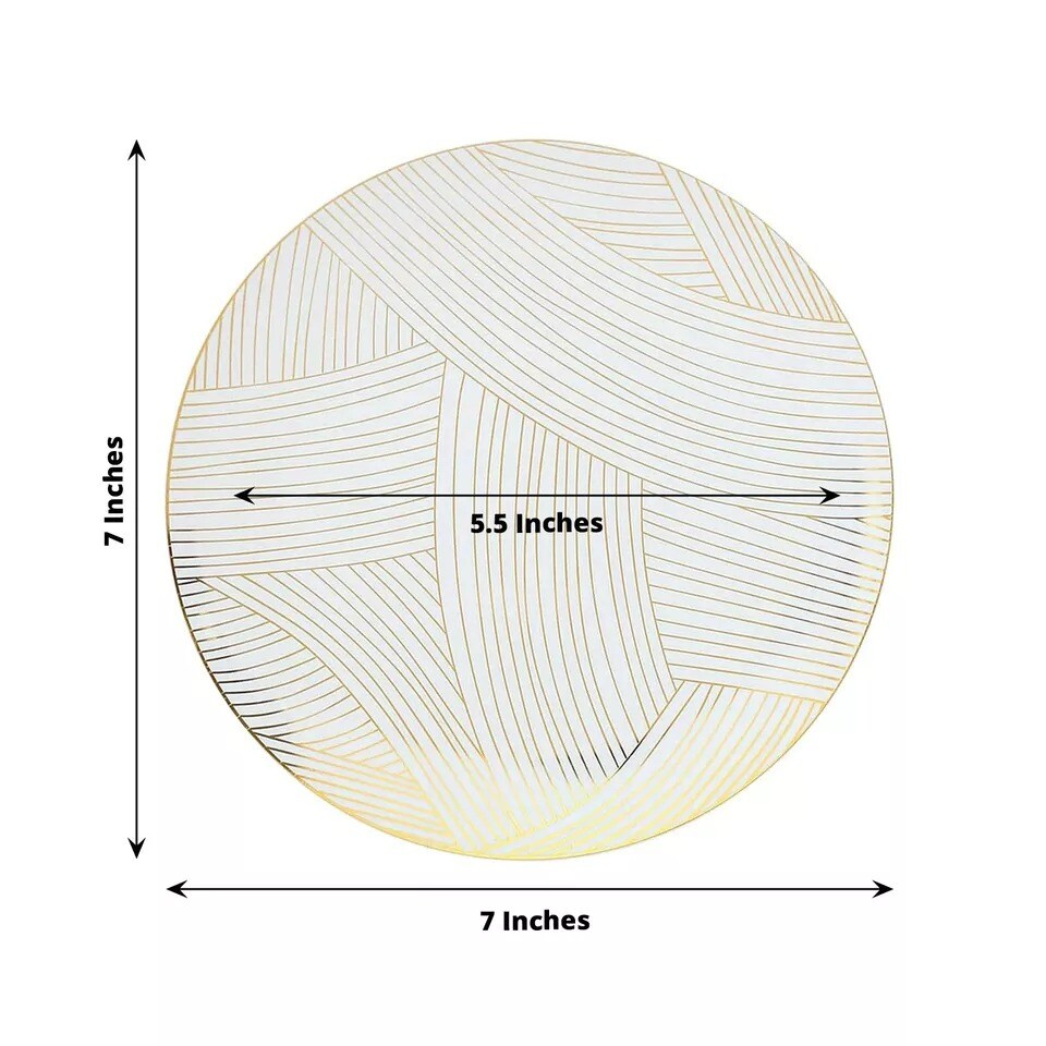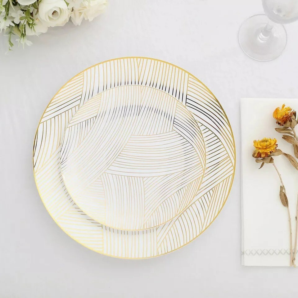 10 White 7" Round Plastic Salad and Dinner Plates Gold Strokes Party Decorations