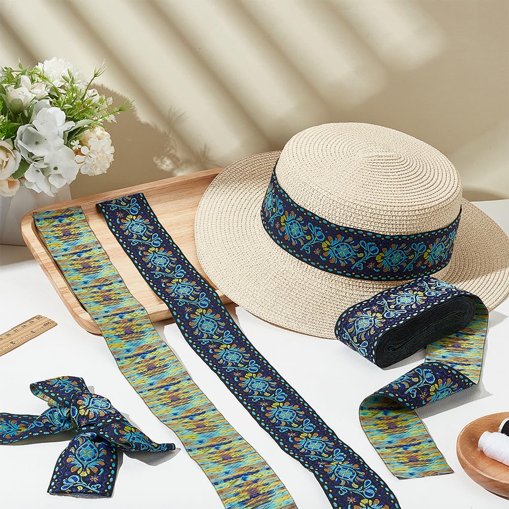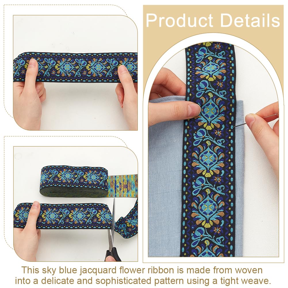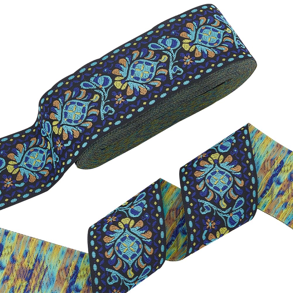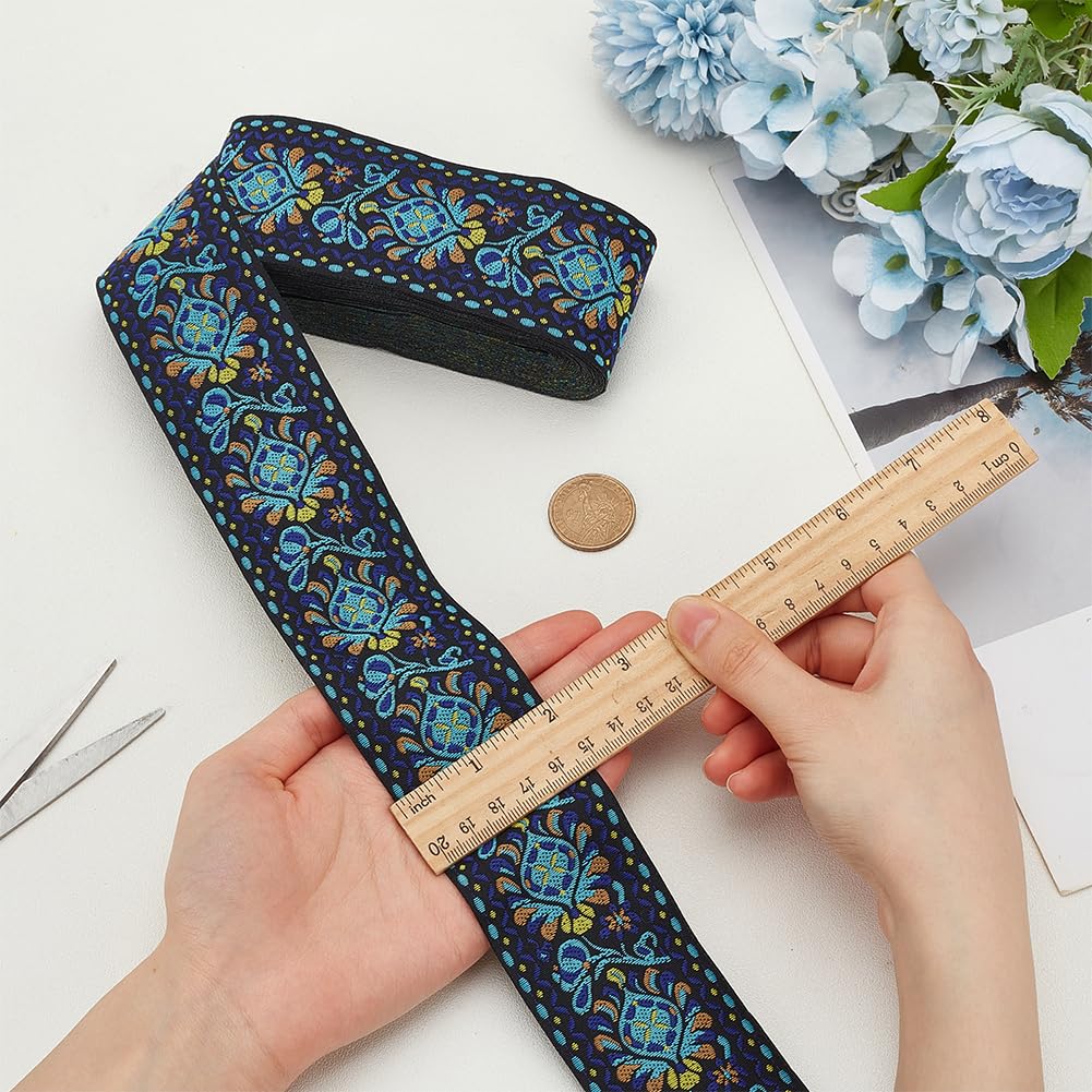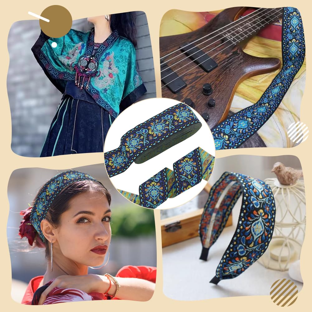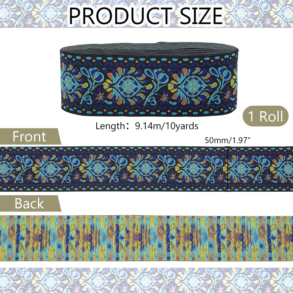 10 Yards Boho Jacquard Fabric Trim with Embroidered Flowers - Blue, 2 Inch Ethnic Style Floral Ribbon for Sewing, Handmade Bag Strap Making & DIY Clothing Decoration