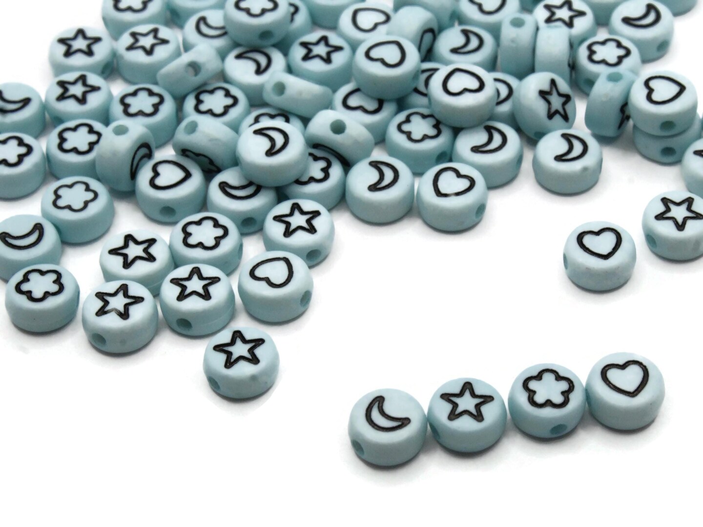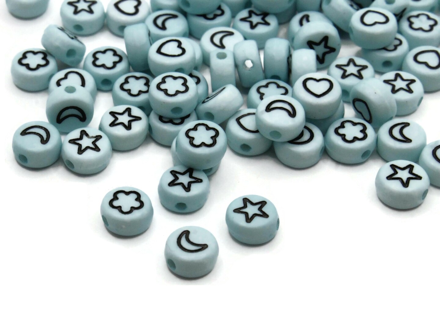 100 7mm Blue Heart, Star, Flower and Moon Mixed Small Plastic Flat Round Coin Beads