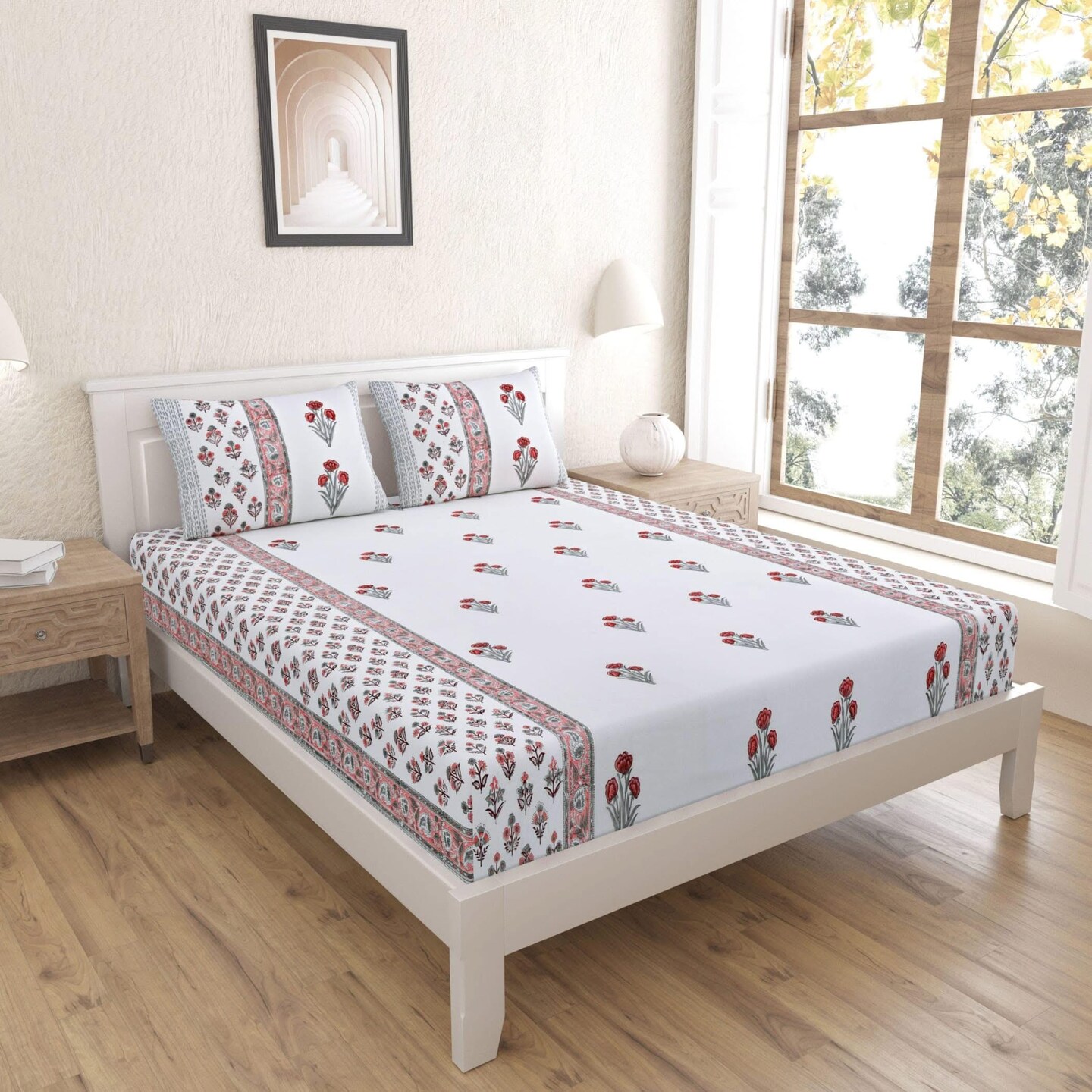 100% Cotton Floral Print Fitted Sheet Set 3pcs 150 Thread Count Indian Ethnic Bedsheets Premium Soft & Breathable Bedding Set Home Decor Sheets (king, Queen)