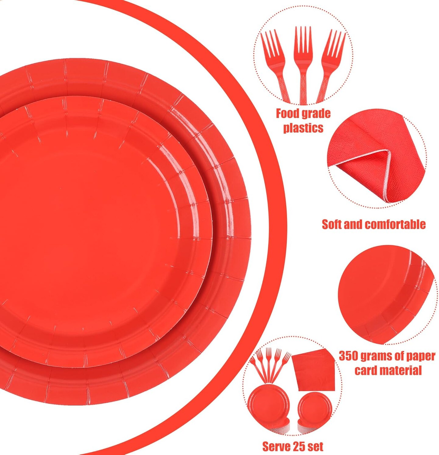 100 Count Red Paper Plates and Napkins Red Party Tableware Set Red Disposable Plates Napkins and Forks for Wedding Birthday Party Bridal Shower Baby Shower, Serve 25