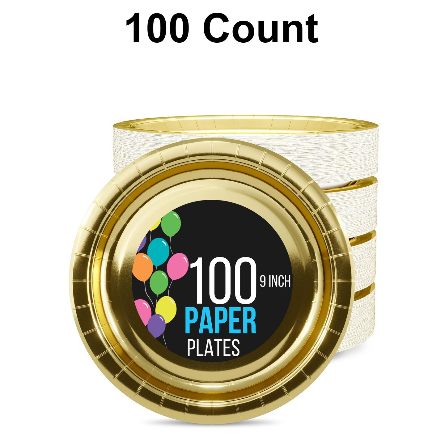 100 Count Reflective Gold Paper Plates Elegant Disposable Dinnerware for Weddings and Parties 9 Inch