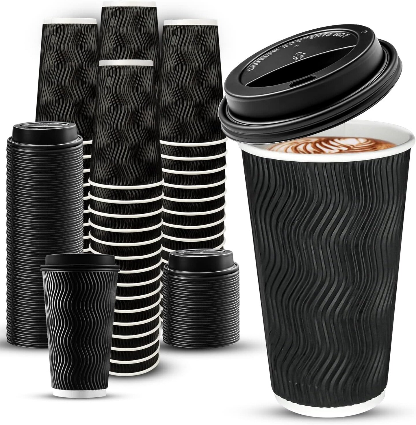 100 Pack 16 oz Disposable Insulated Coffee Cups with Lids, Paper To-Go Coffee Cups for Coffee Bars, Hot Chocolate, Cocoa, and Hot Tea Drinks - Black