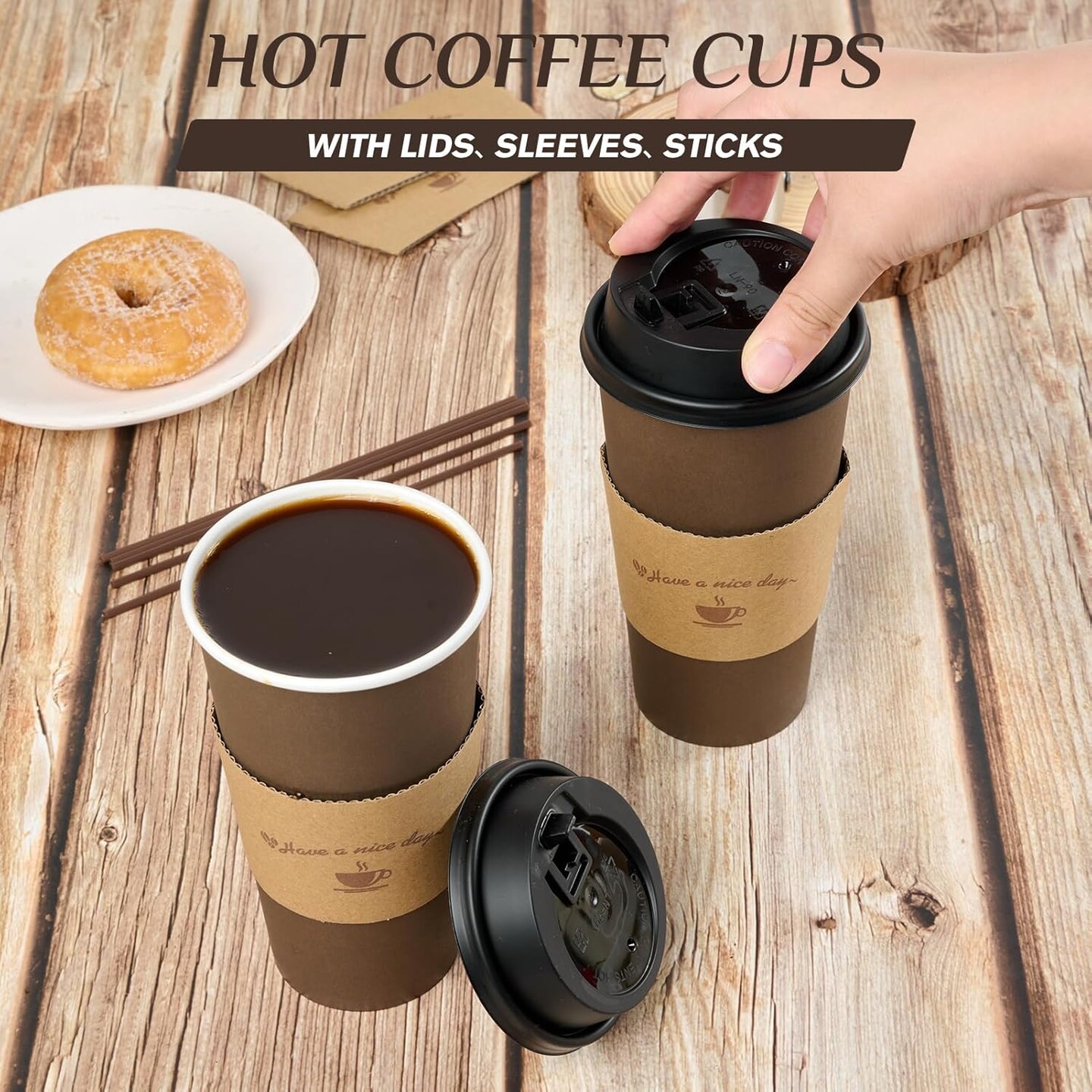 100 Pack 20 oz Paper Coffee Cups, Brown Disposable Coffee Cups with Lids, Sleeves, Sticks, Drinking Cups for Hot Coffee, Water or Juice, Hot Paper Cups for Home, Restaurant, and Store