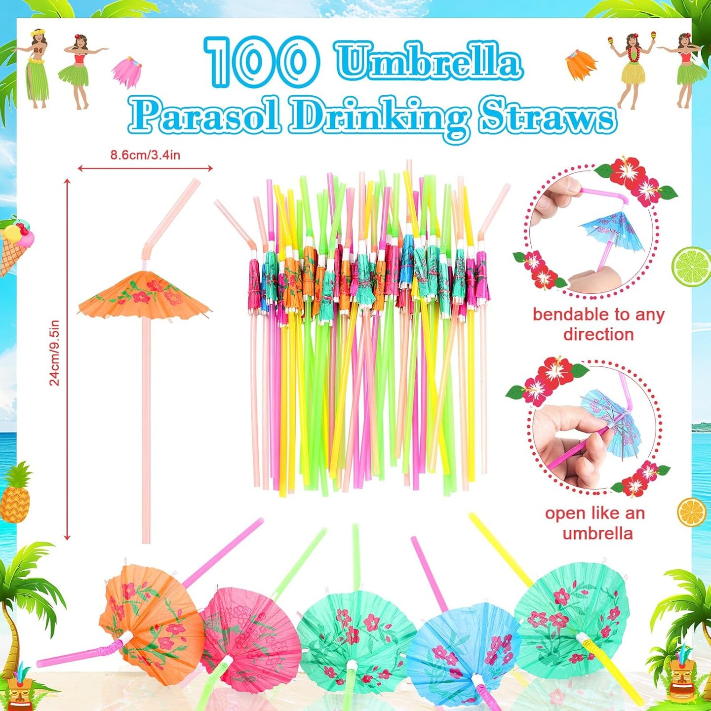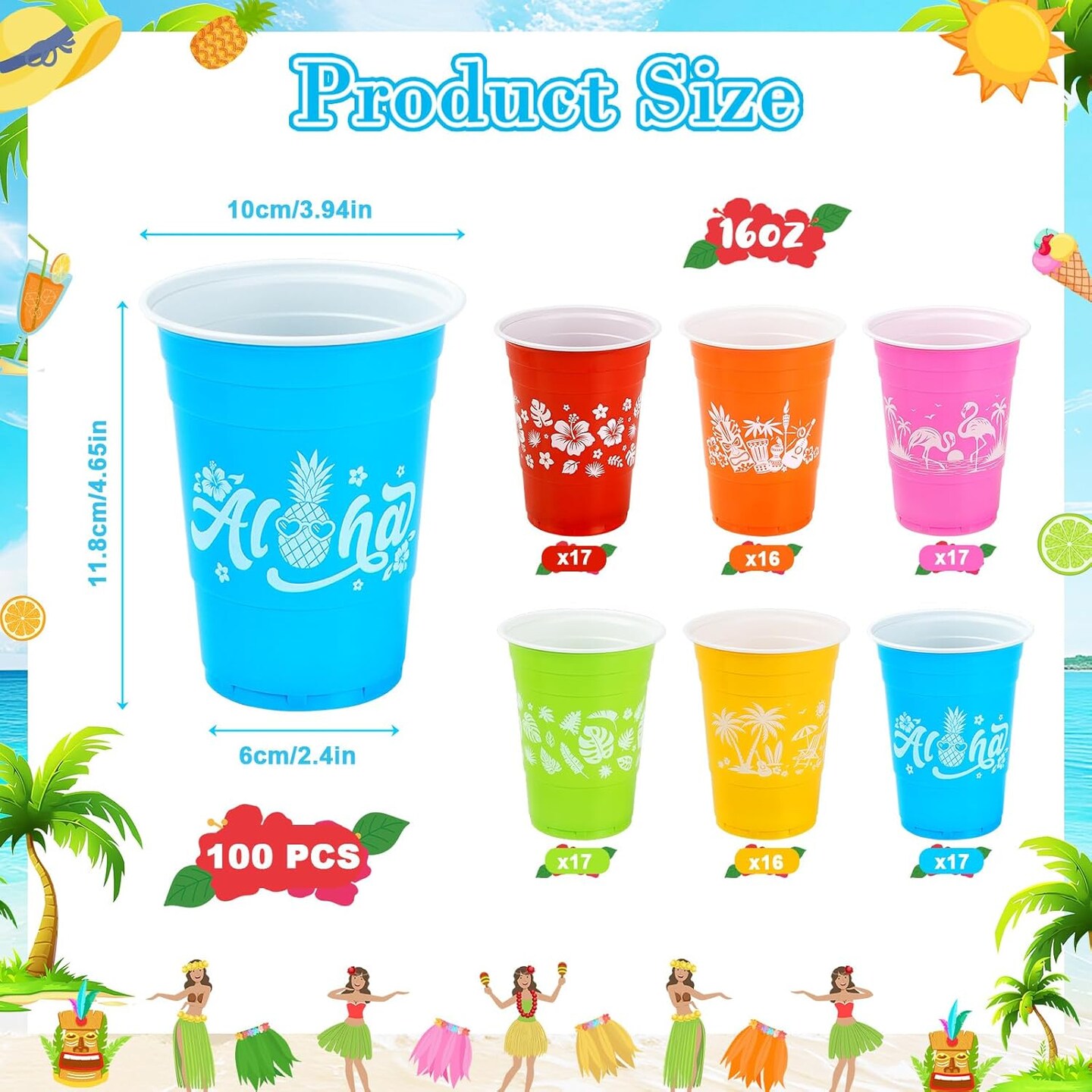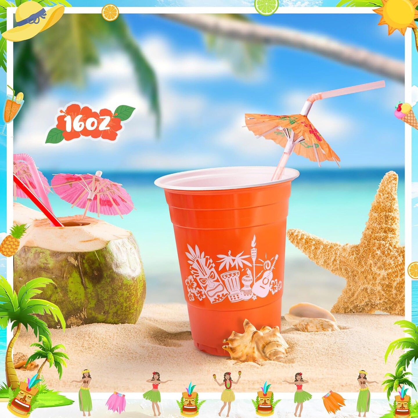 100 Pack Hawaiian Luau Cups with Parasol Straws 16 oz Plastic Tropical Cups
