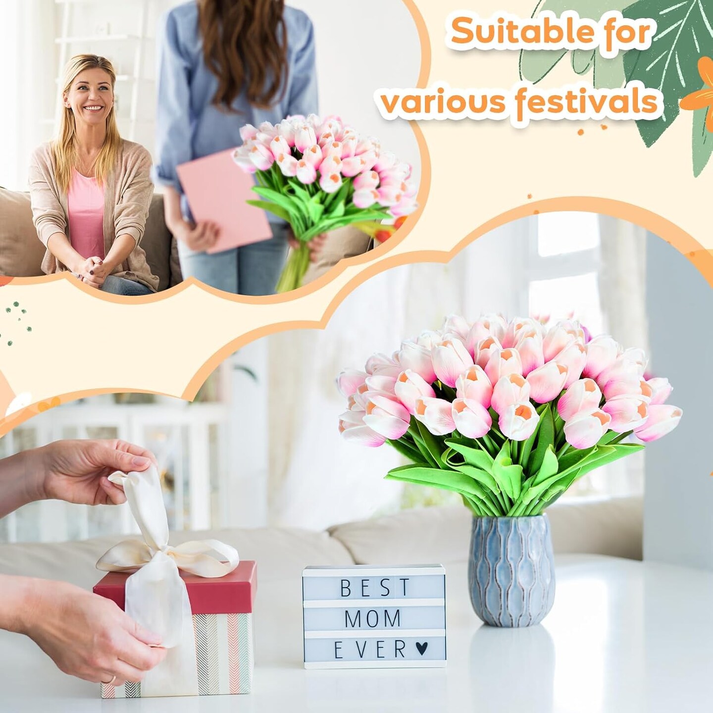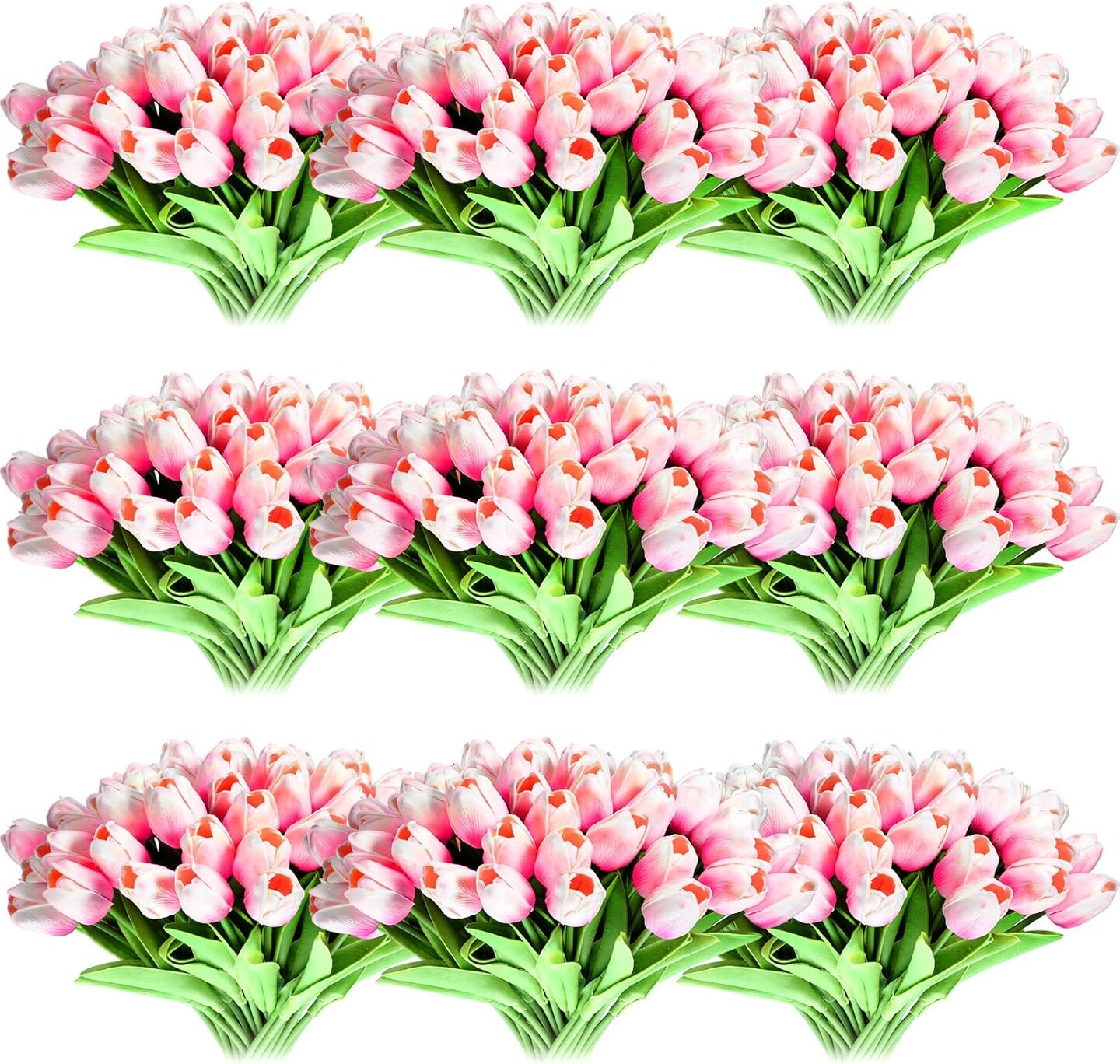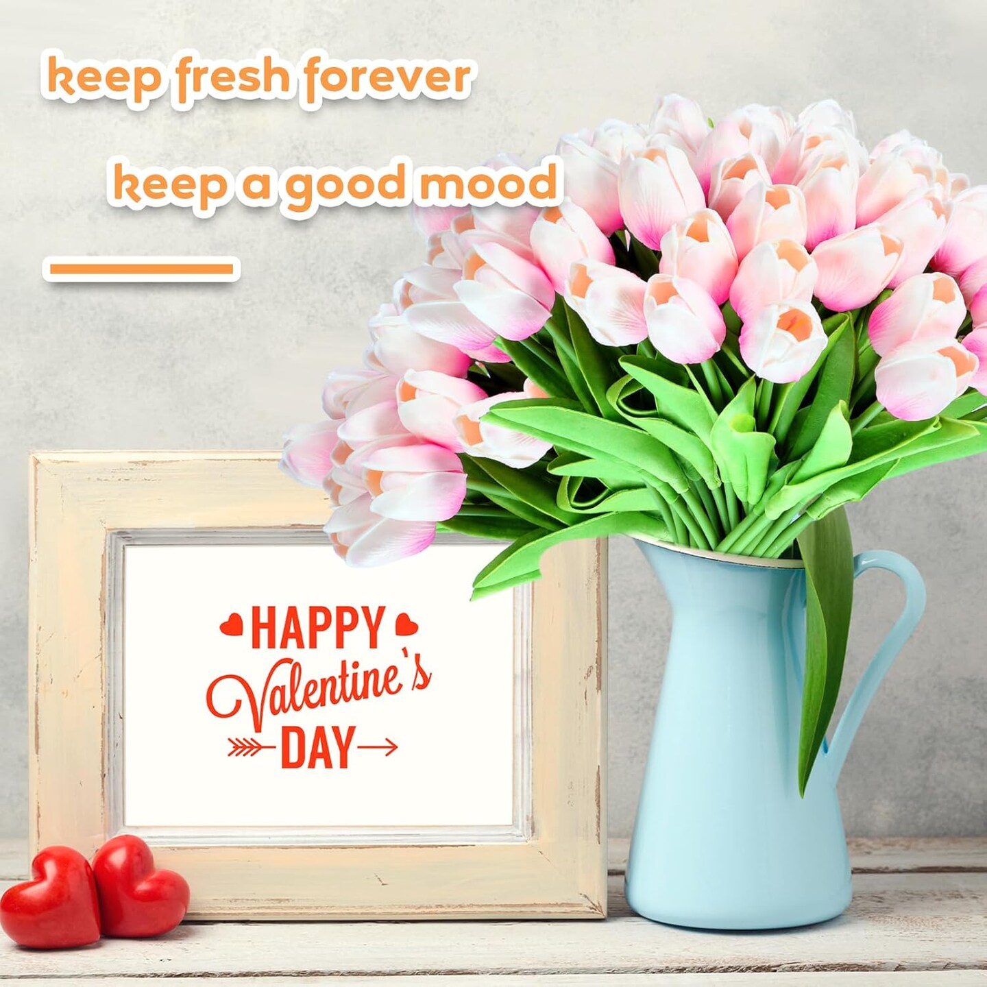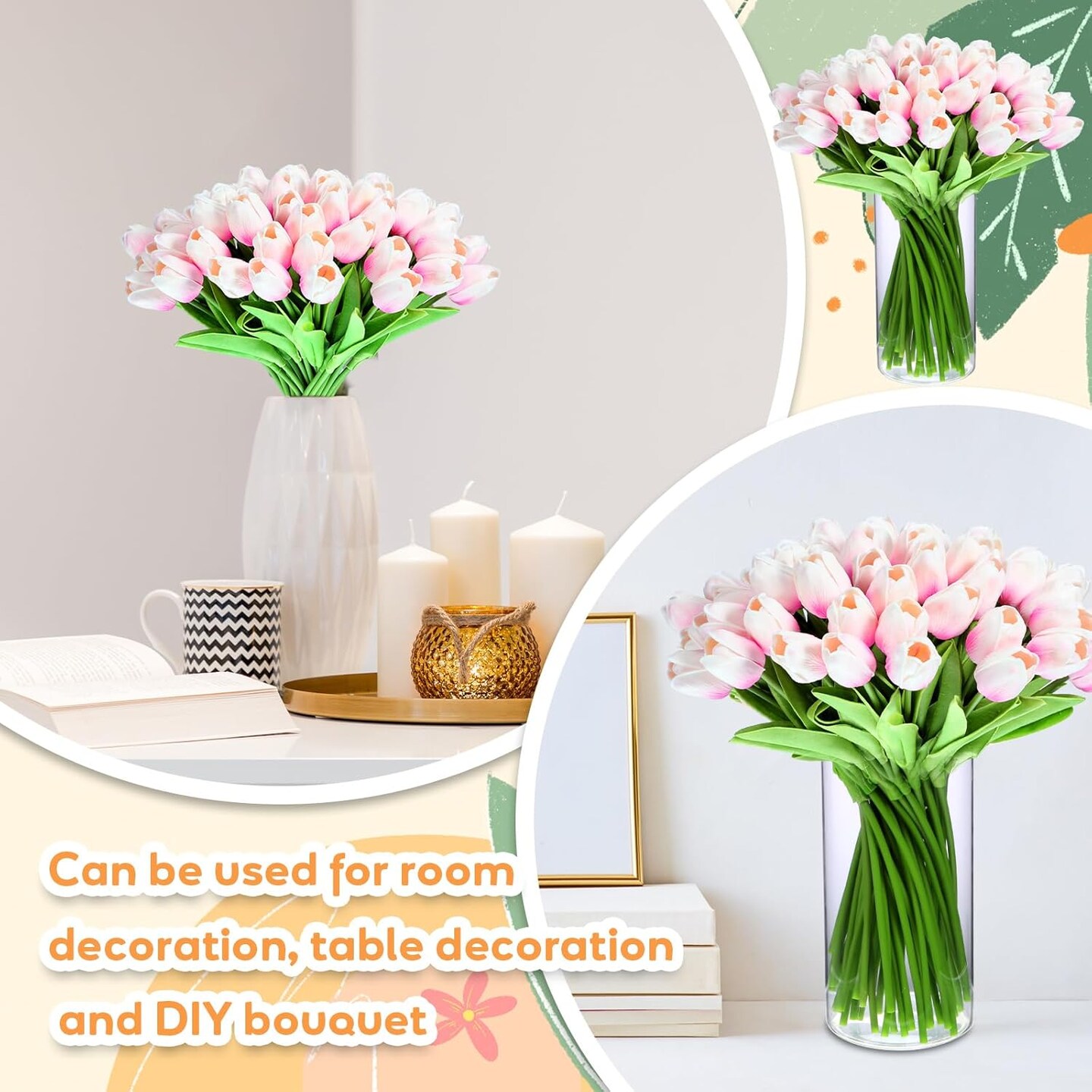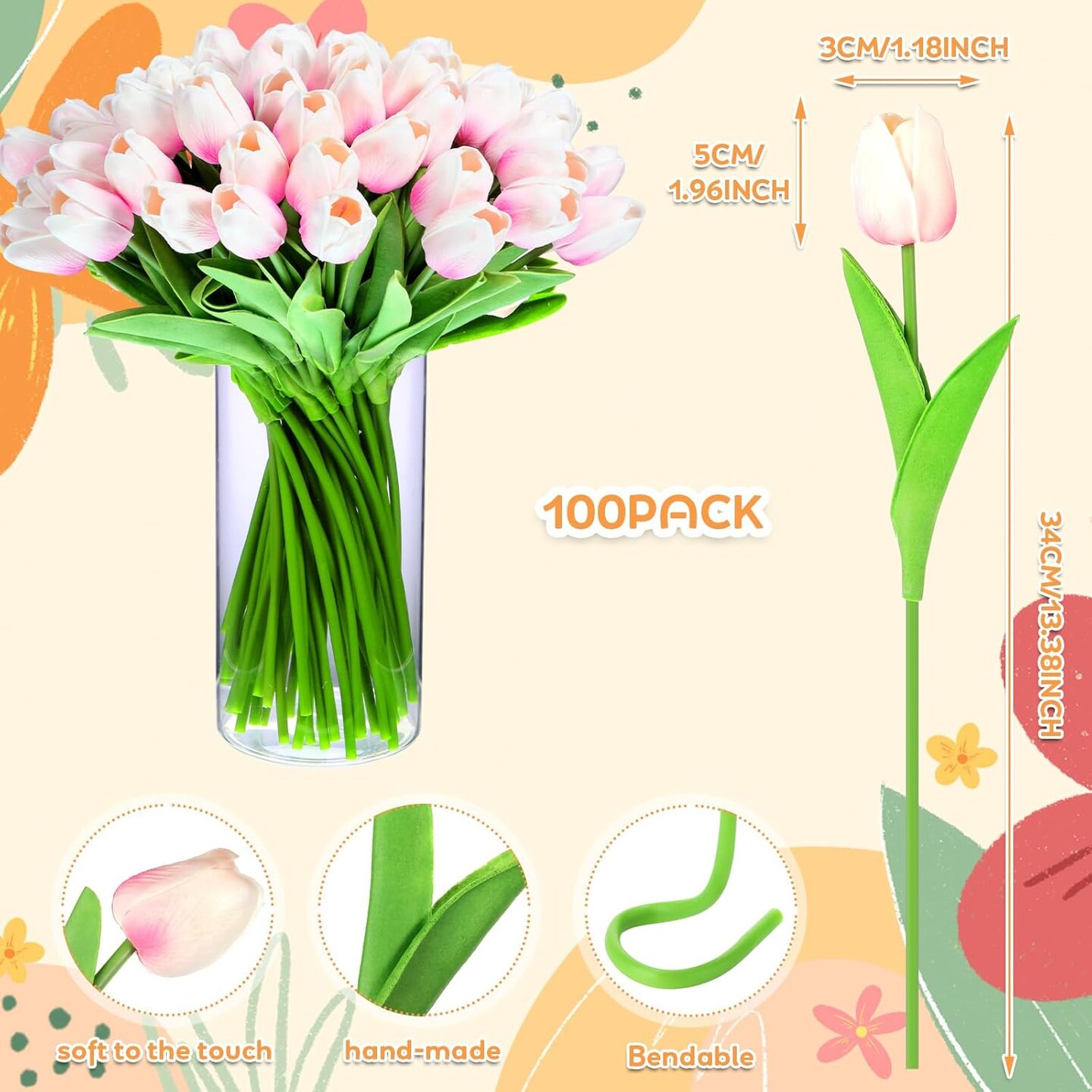 100 Pcs Artificial Real Touch Tulips Fake Artificial Tulip Flower Bulk Bouquet with Stem for Table Centerpieces Wedding Bridal Easter Mother's Day Garden Home Decor, 13.4''(Light Pink)