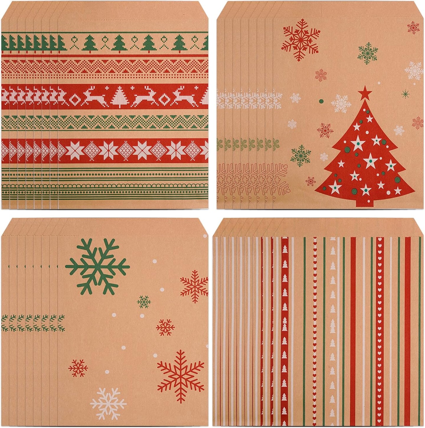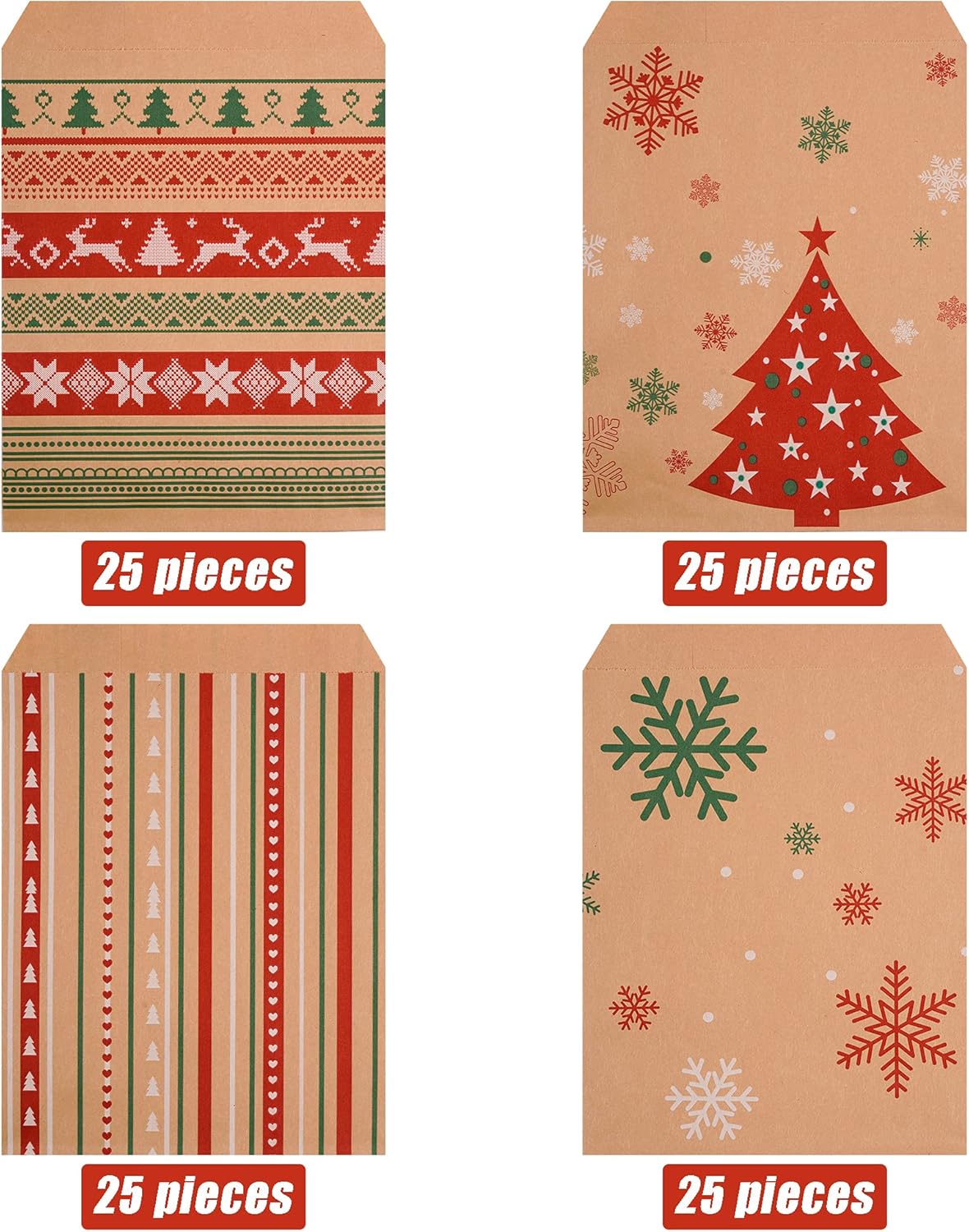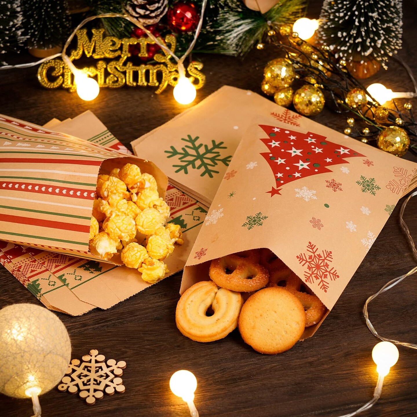 100 Pieces Christmas Kraft Treat Bags Christmas Goody Bags Kraft Holiday Paper Gift Bags Buffet Paper Bags for Christmas Party Favor,4 Styles