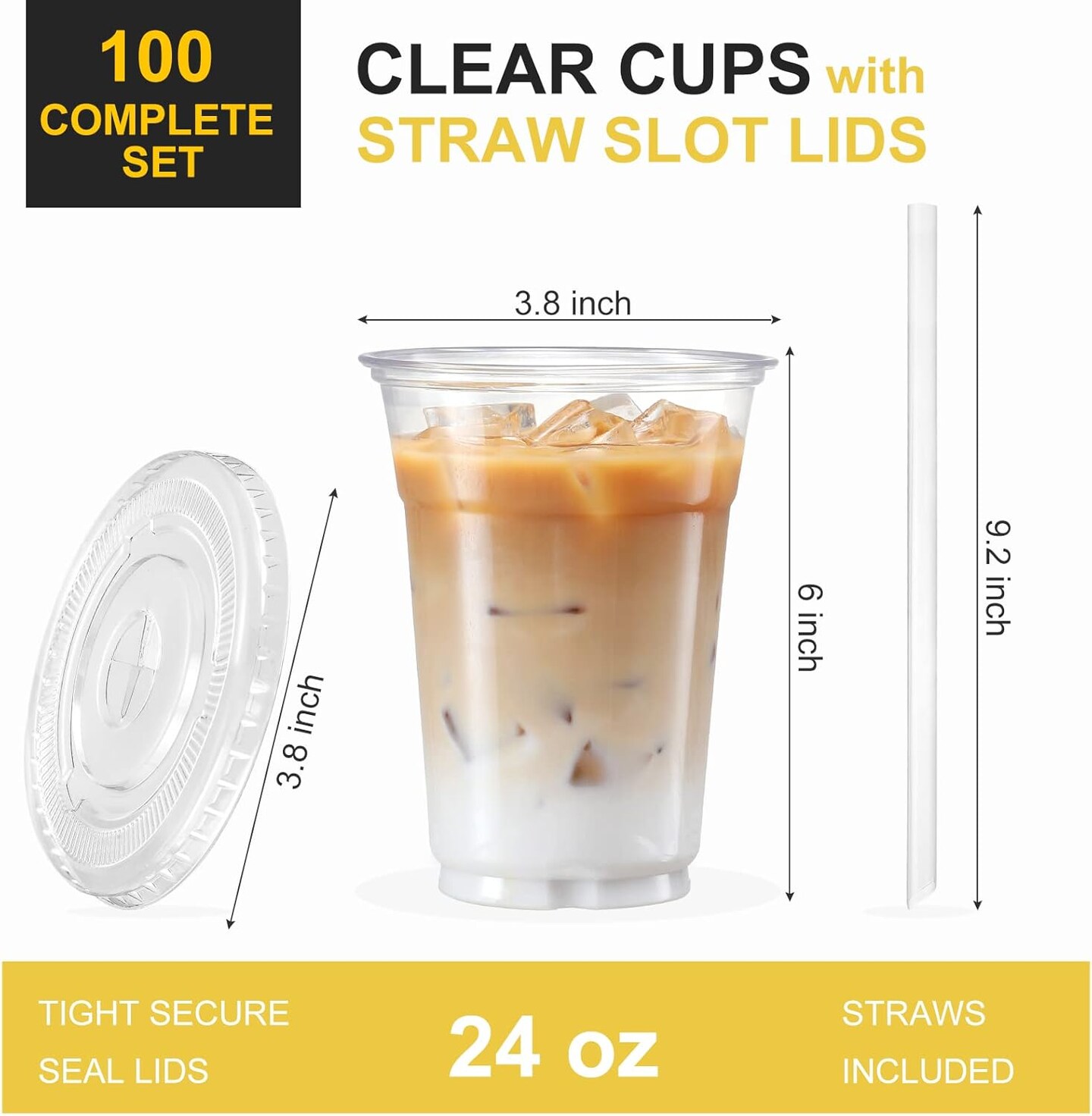 [100 Sets - 24oz] Plastic Cups with Lids and Straws, Disposable Cups for Iced Coffee, Smoothie, Milkshake, Cold Drinks - Clear