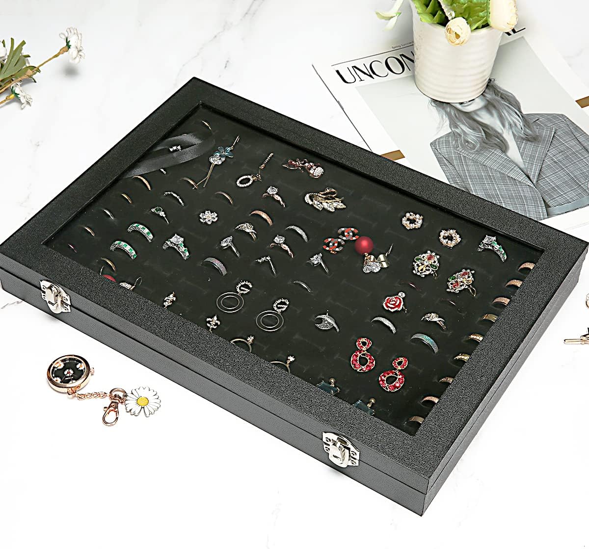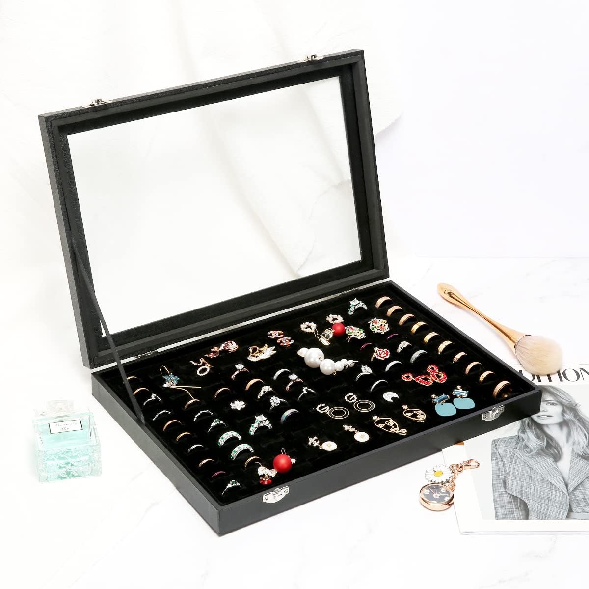 100 Slots Ring Display Case with Transparent Lid Ring Storage Box Ring Holder Case For Store Display Home Jewelry Storage Display Ring Organizer Earring Holder Display Tray