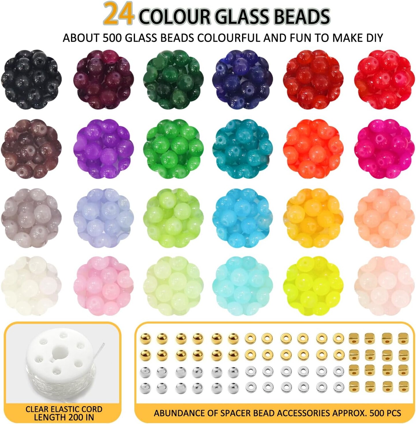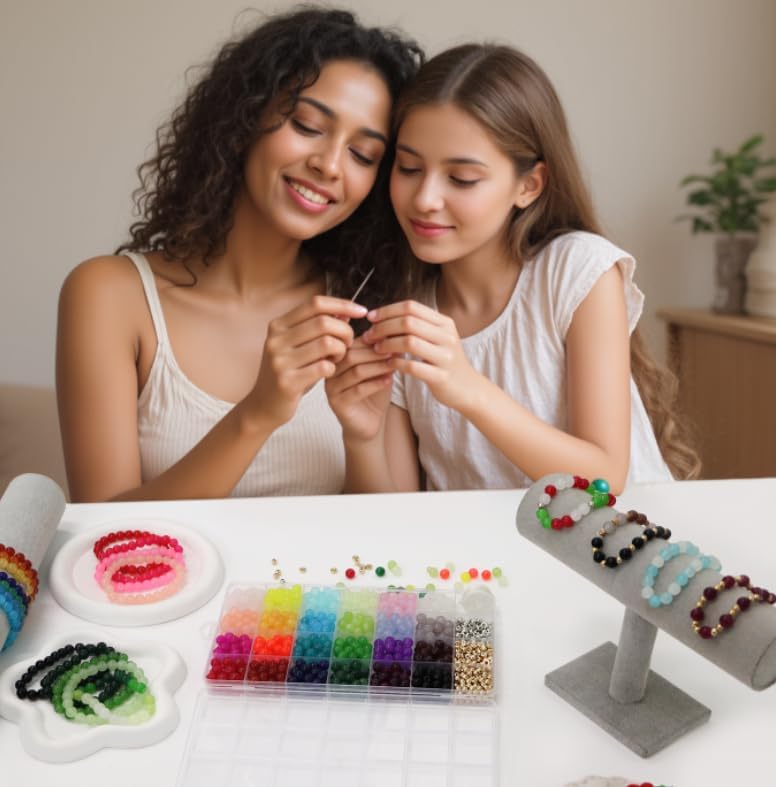 1000+ Pcs 8mm Glass Beads Kit – 24 Colors Crystal Round Beads Set with Spacer Charms & Elastic String for DIY Bracelet & Jewelry Making