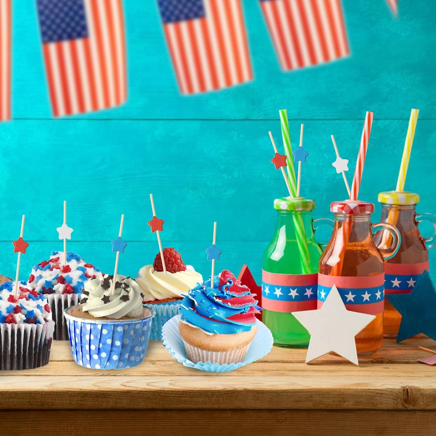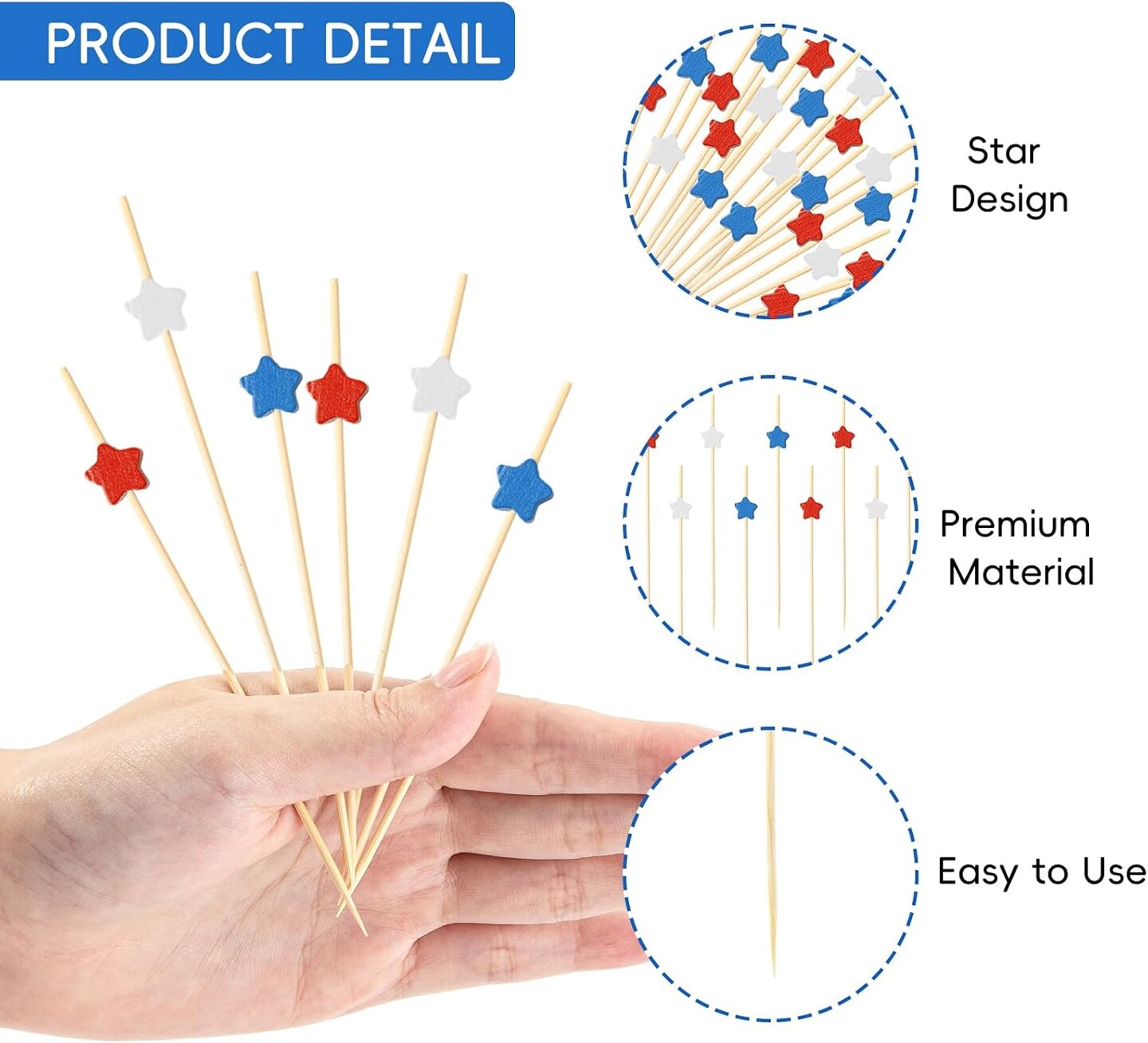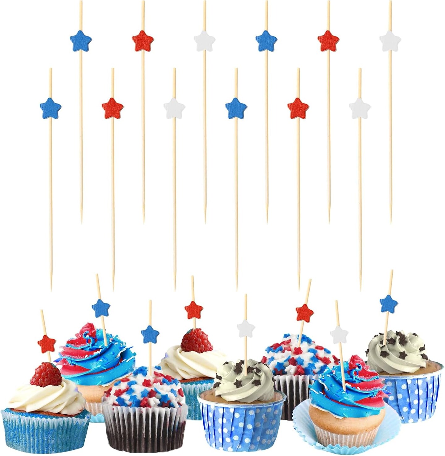 100Pcs 4th of July Patriotic Cake & Cupcake Toppers, Red White Blue Star Bamboo Toothpicks Cocktail Sticks for Appetizers Fruit Food Drink Cake Independence Day Birthday Party Decoration, 4.7Inch