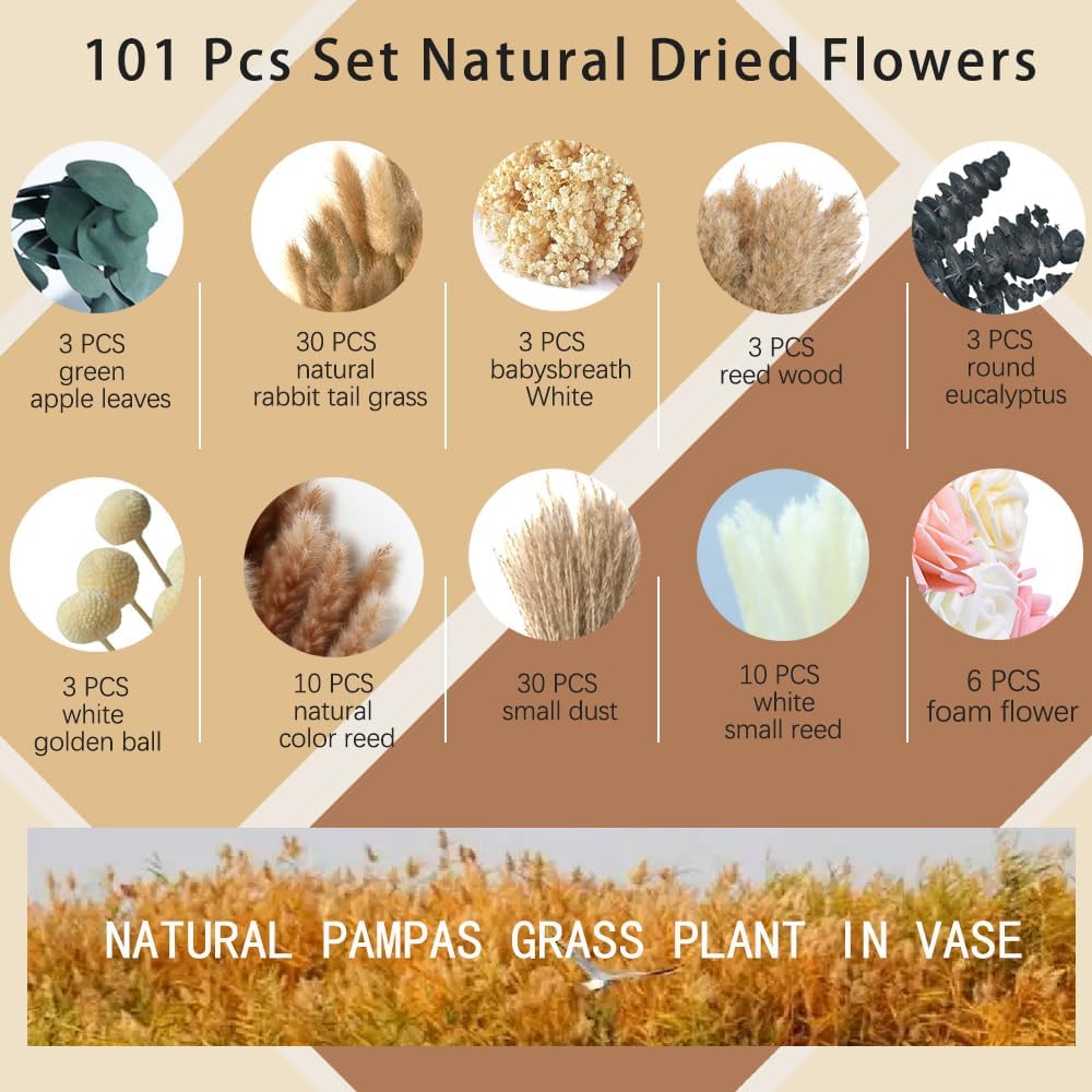 101pcs Artificial Flowers in Vase Natural Dried Pampas Grass Decor with Vase Boho Home Decor Bouquet Bunny Tails Dried Flowers, Reed Grass Bouquet for Wedding Floral Arrangements (101pcs)