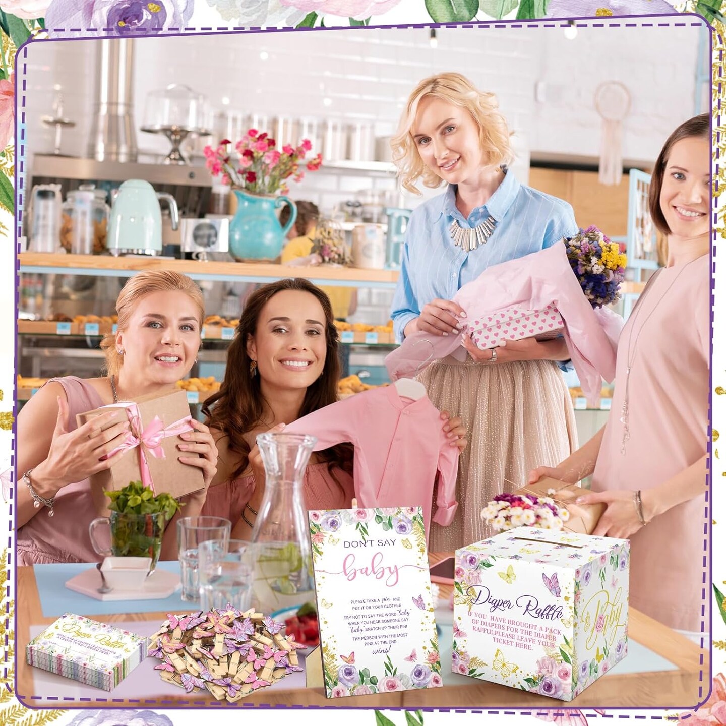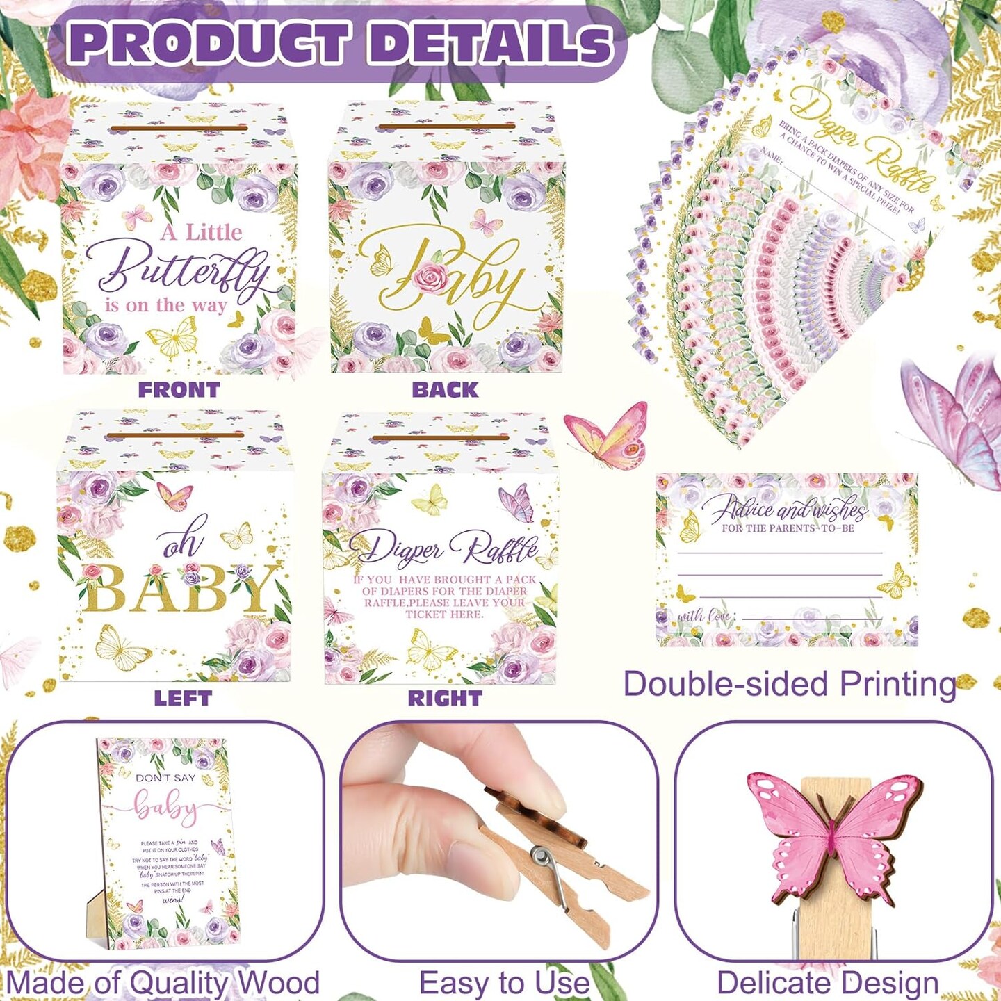 102 Pcs Butterfly Baby Shower Game Supplies Diaper Raffle Tickets with Diaper Raffle Card Box Don't Say Baby Sign Mini Butterfly Clothespin Game