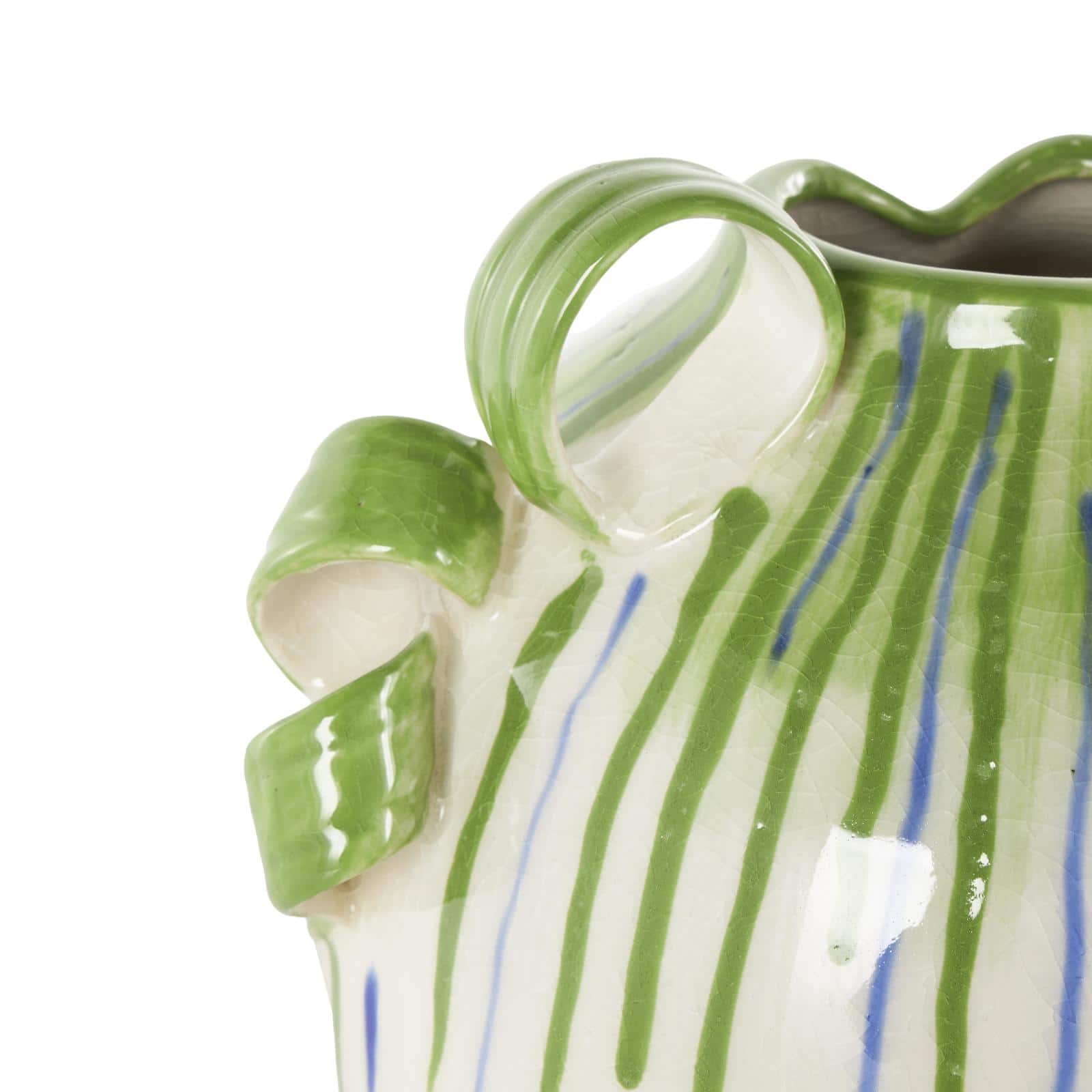 10.5" White Ceramic Vase with Green & Blue Drip Design & Handles