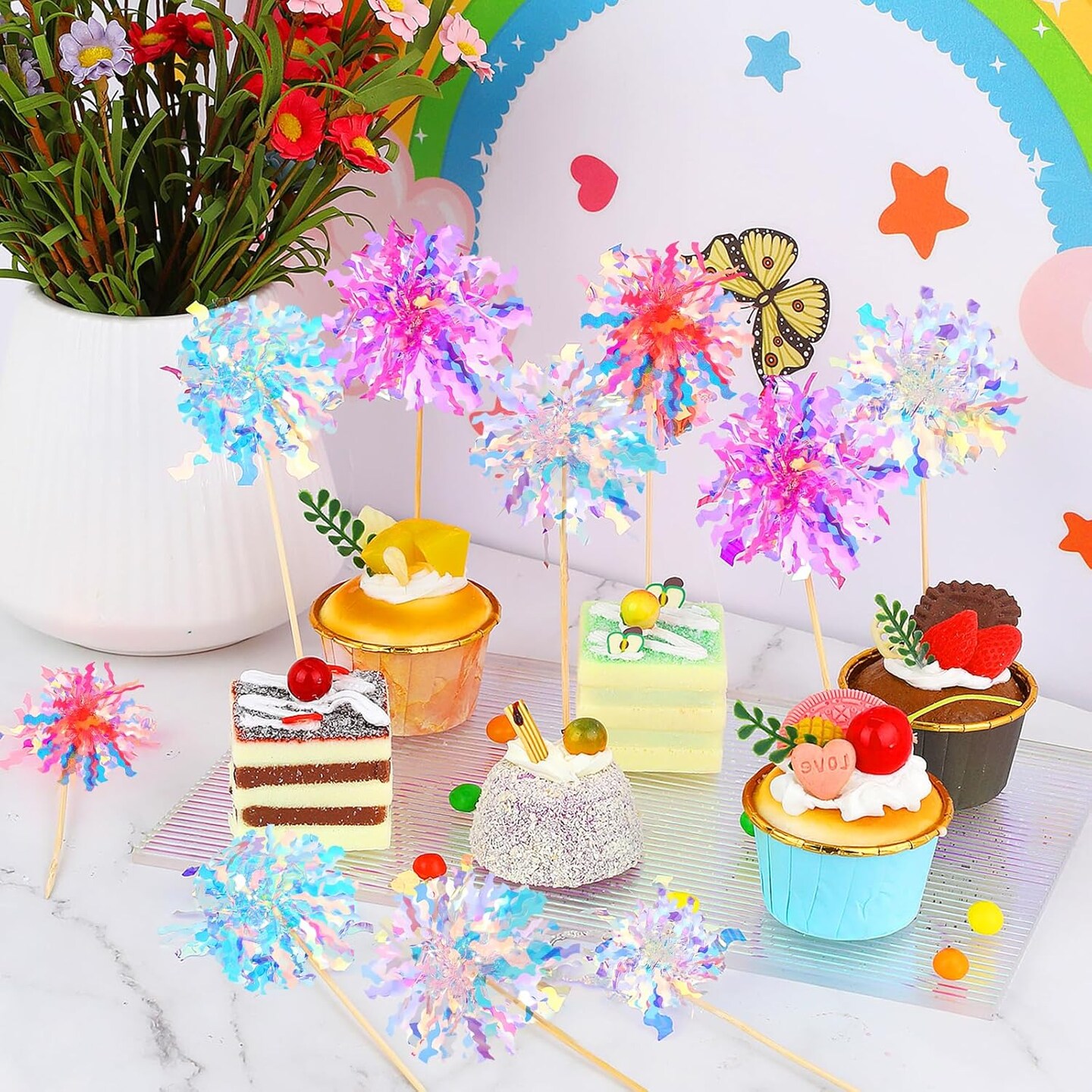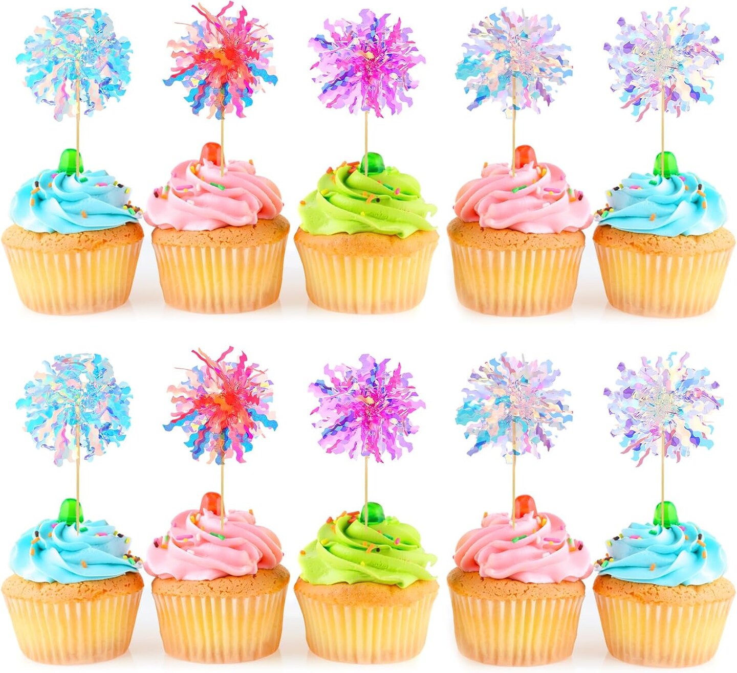 10Pcs Happy Birthday Cake Toppers, Foil Firework Cupcake Toppers, Sparkle Tinsel Cake Toppers Cocktail Food Toothpick for Birthday Wedding Baby Shower Graduation Party Supplies
