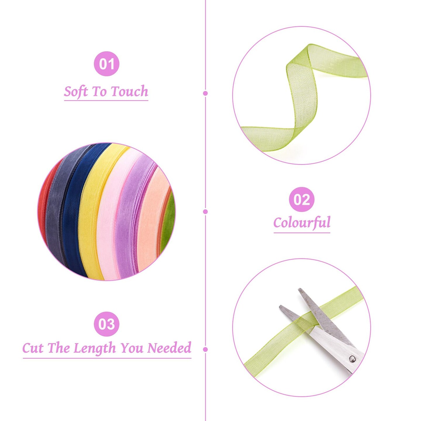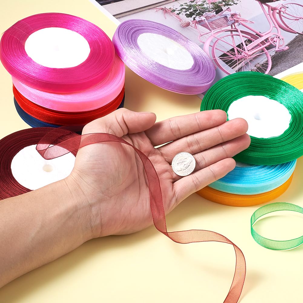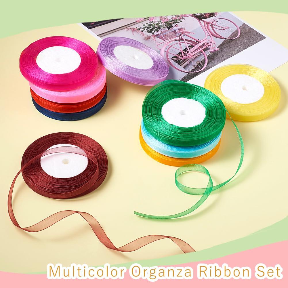 10Rolls 500 Yards Organza Ribbon Roll 3/8" Wide Fabric Sheer Ribbon Trim Cord in Bulk Mixed Color for Gift Wrapping Hair Bows Crafts Christmas Party Decor Jewelry Making