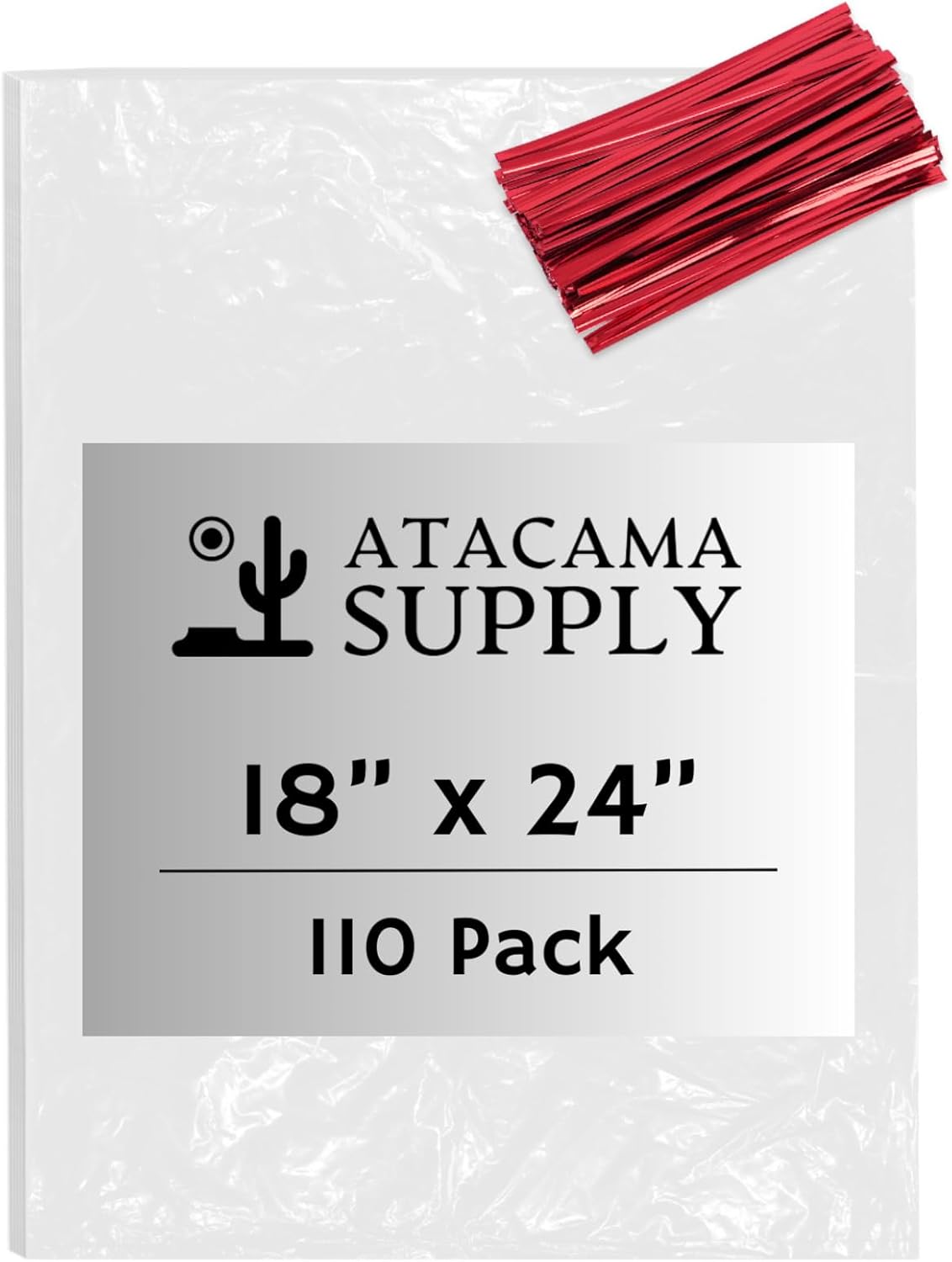 [110 Pack] 18x24 inches 1 Mil Clear Plastic Flat Open Poly Bags with Ties, Clear Plastic Bags for Proofing Bread, Dough, Storage, Packaging, Storing Toys, Artwork and Photos and More