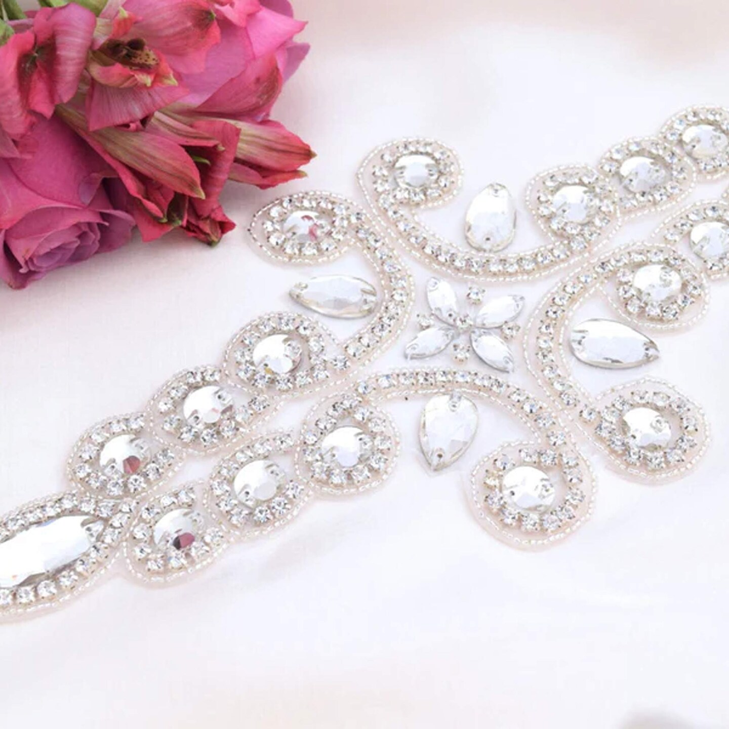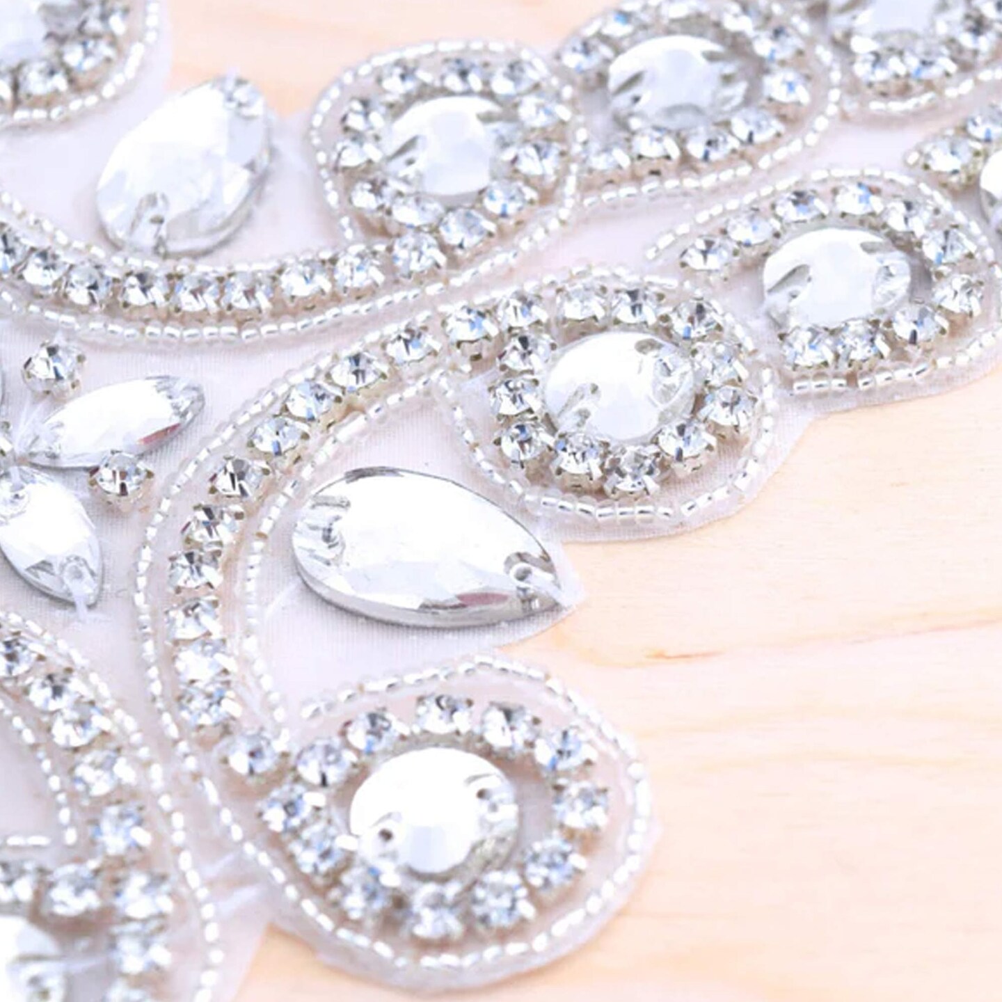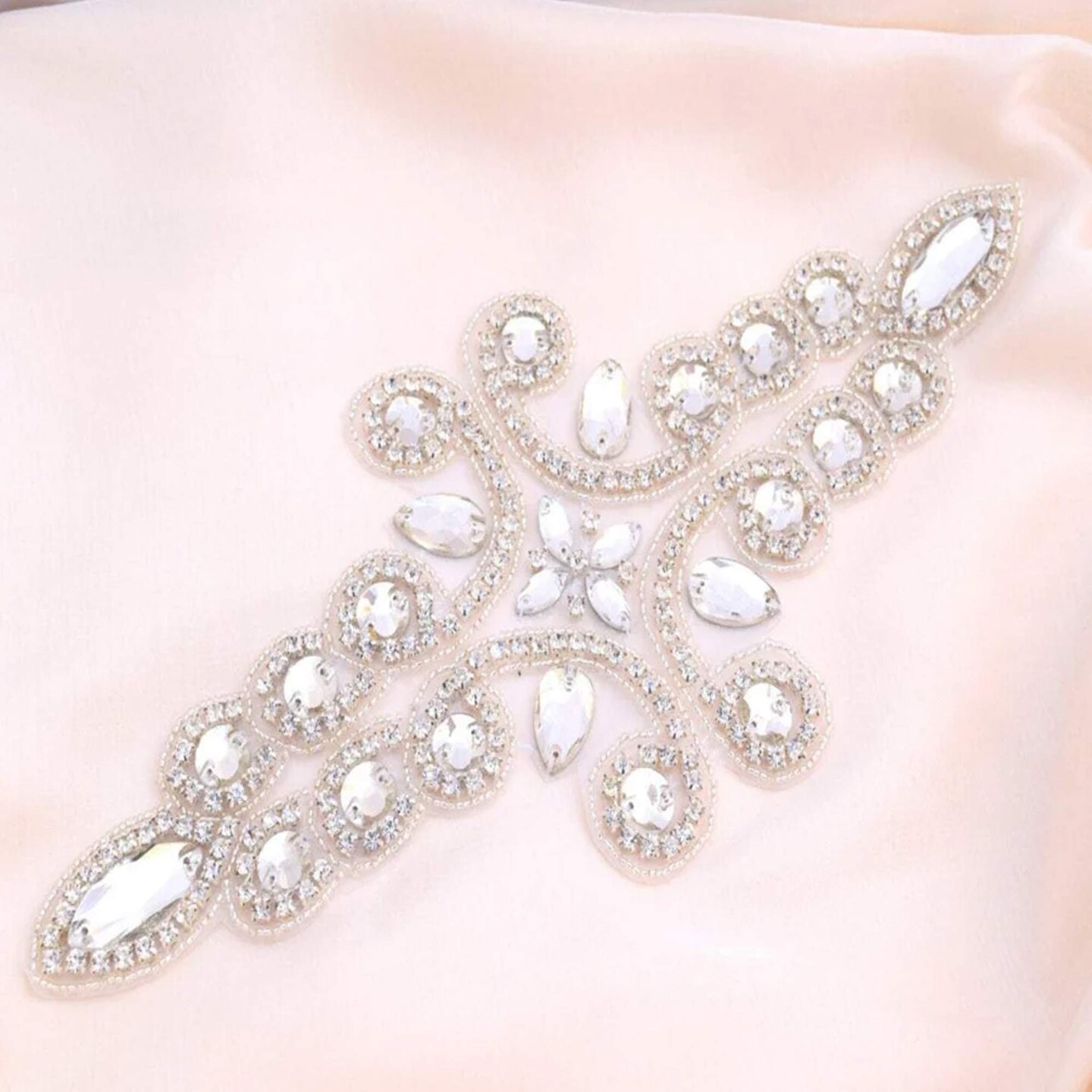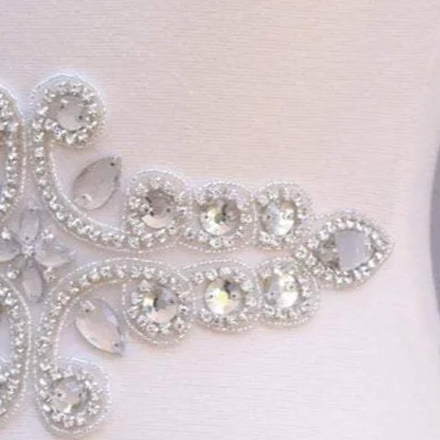 11.5" x 5" Silver Rhinestone Bridal Belt Applique Double Swirl Waist Dress Patch