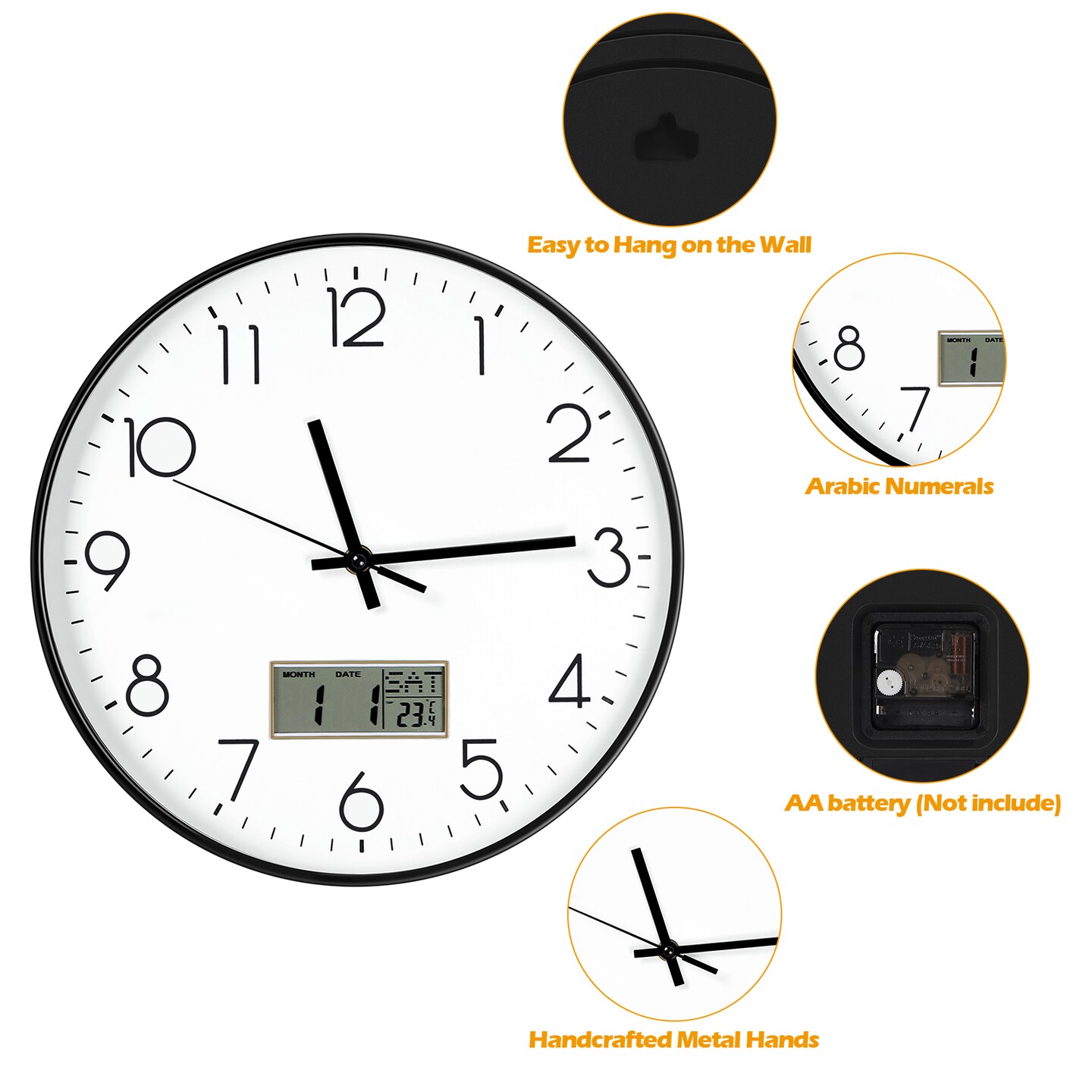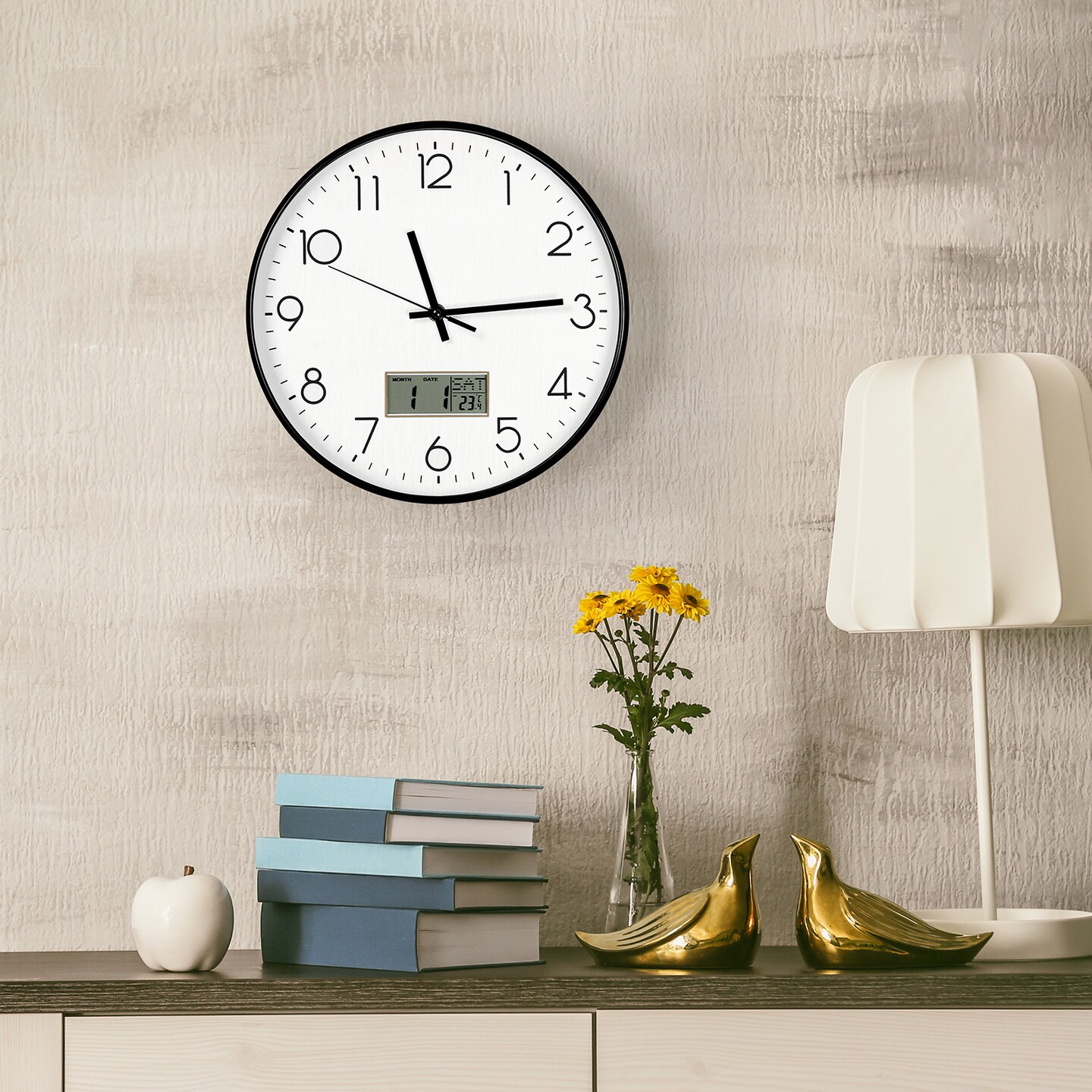 11.8 Inch Wall Clock with Digital Date Temperature Display, Non-Ticking Silent Quartz Clock for Home