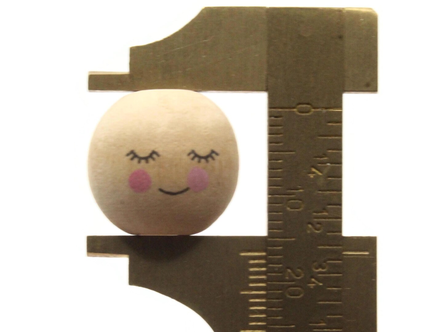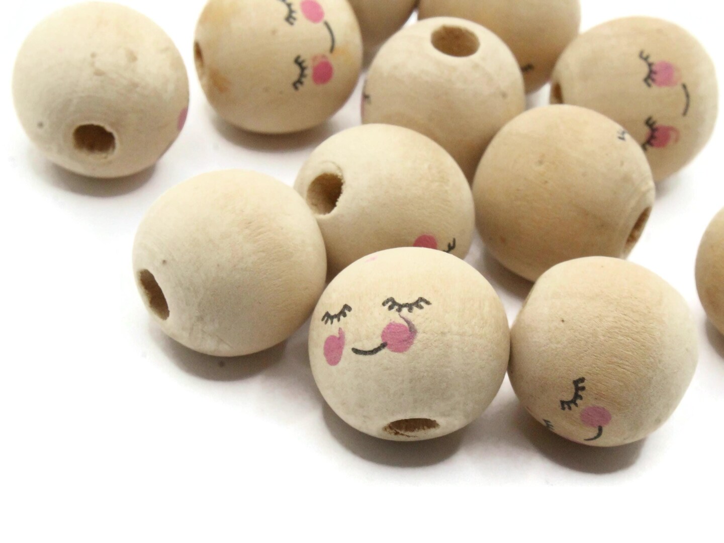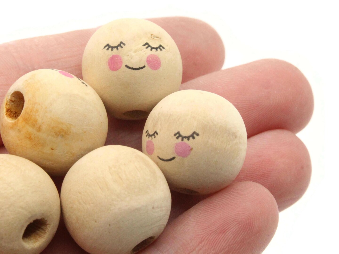 12 17mm Cute Smiling Face with Eye Lashes Doll Head Round Natural Wood Large Hole Beads
