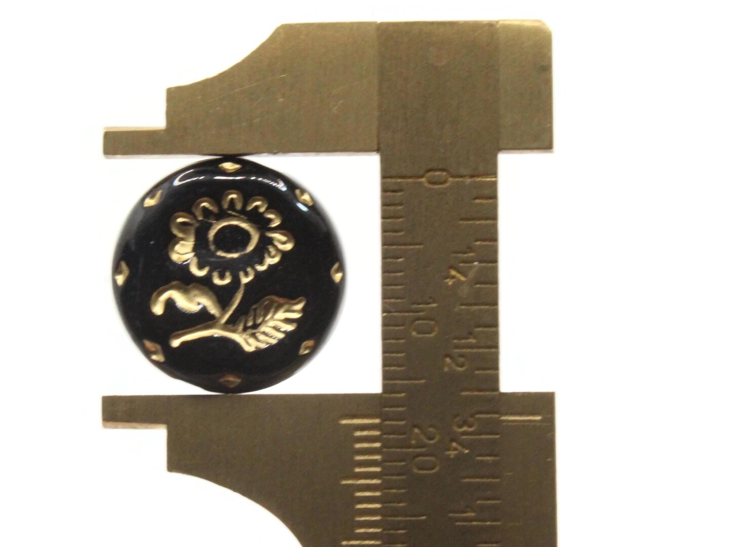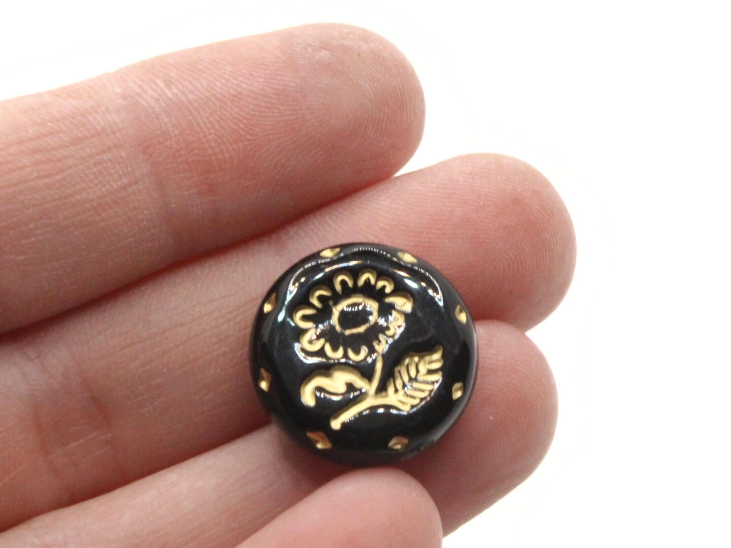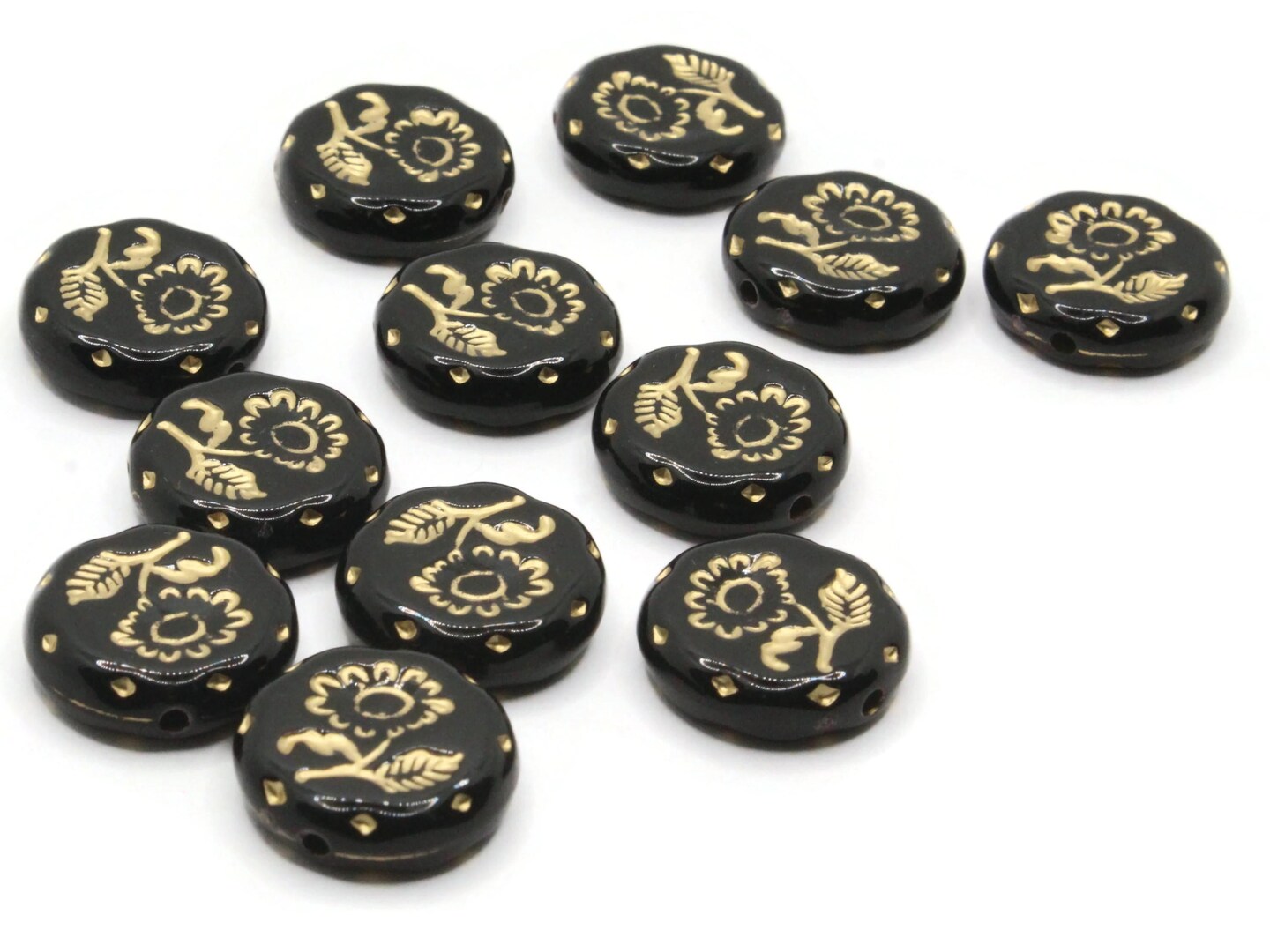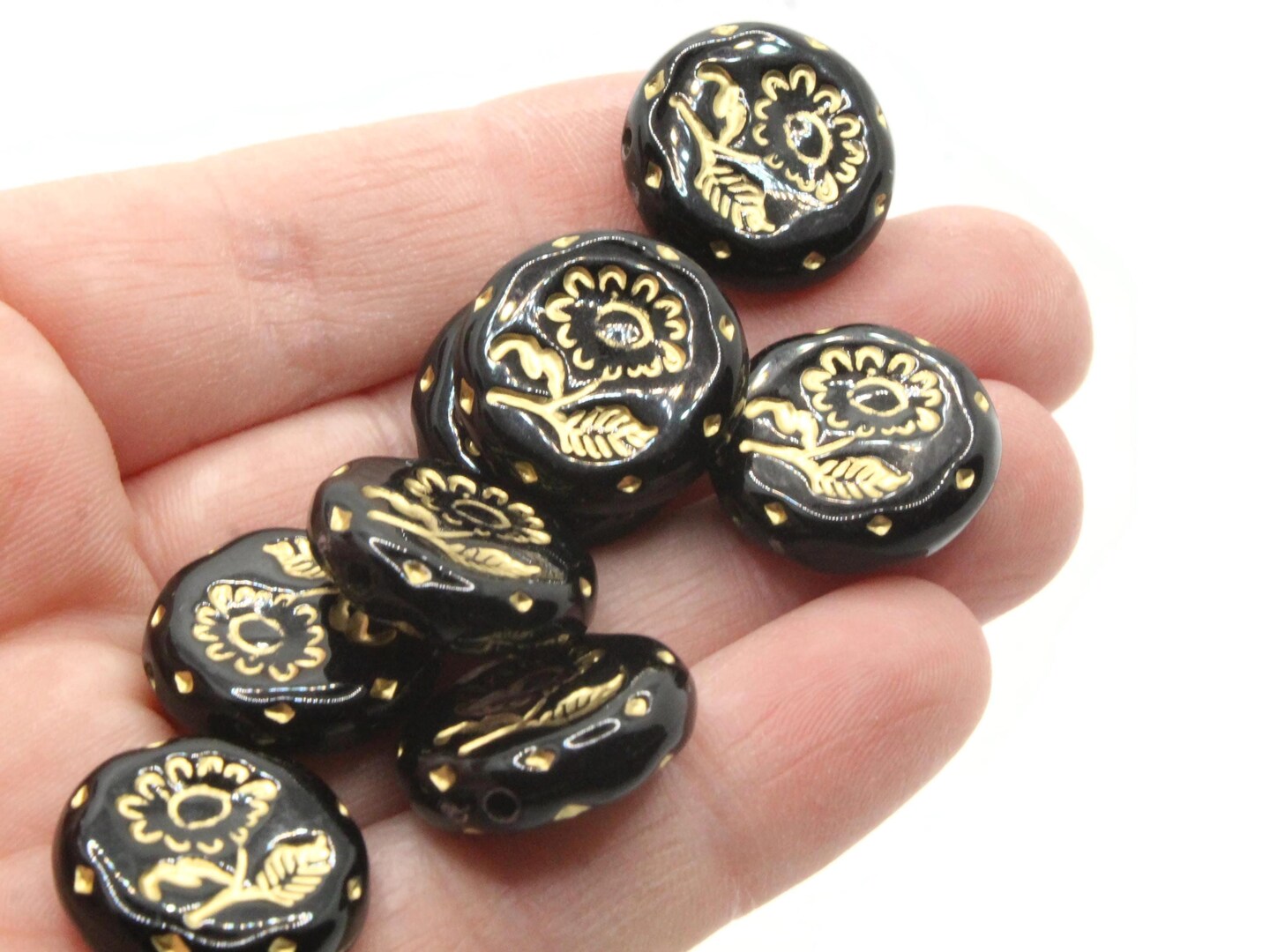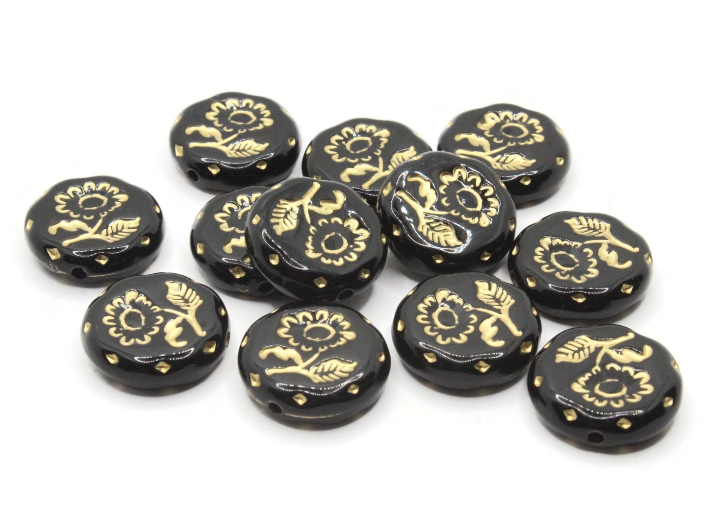 12 18mm Black and Gold Plastic Flat Round Coin Flower Beads
