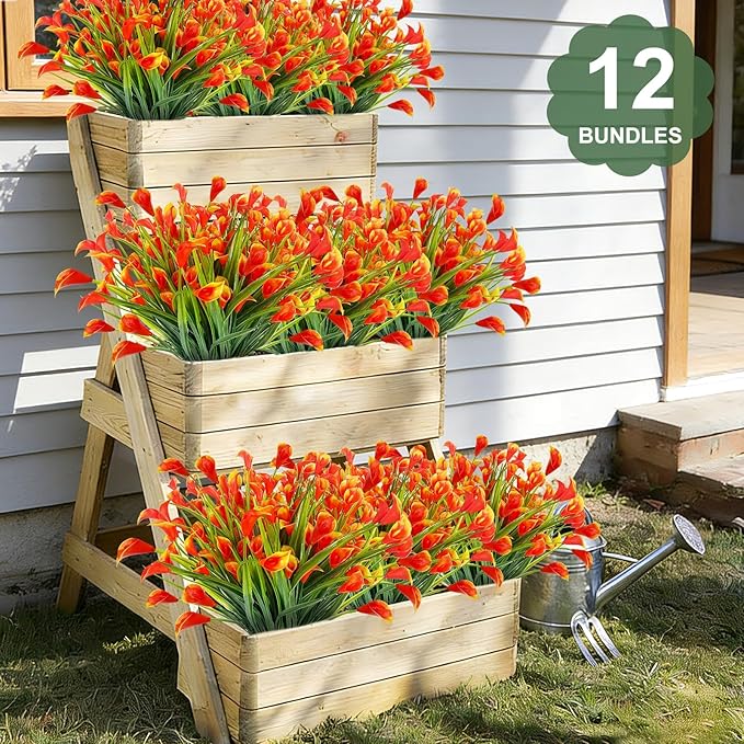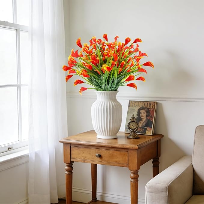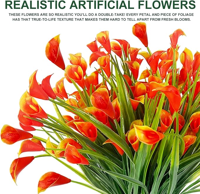 12 Bundles Calla Lily (240 Heads) Artificial Flowers for Outdoors, Fake Plants UV Resistant Faux Plastic Fake Flowers for Indoor Home Porch Yards Summer Cemetery Spring Decor(Orange Red)