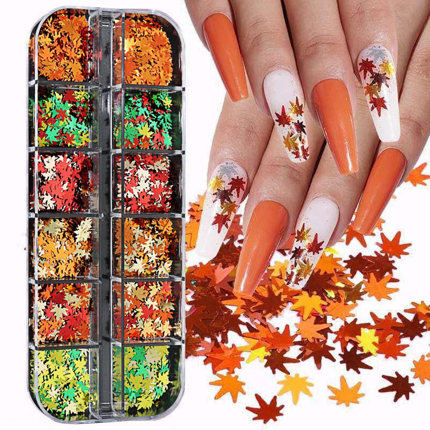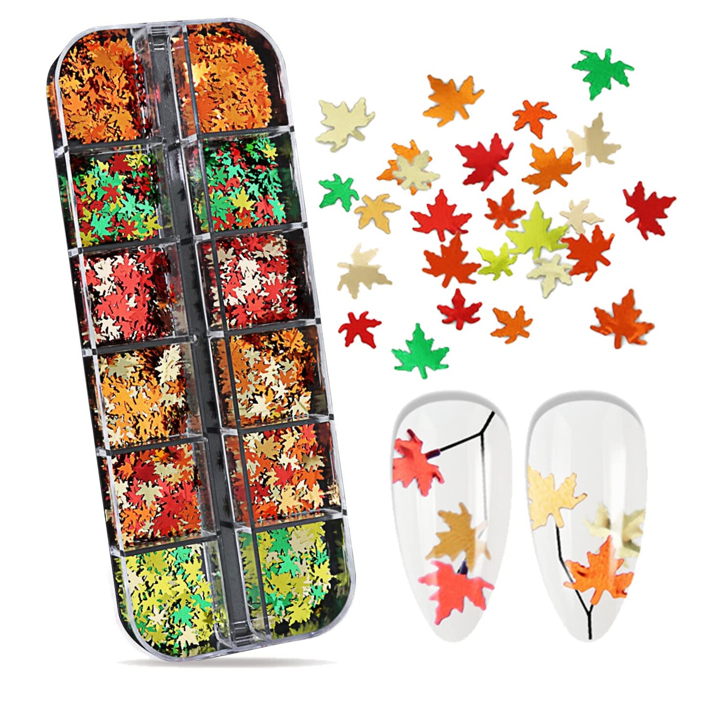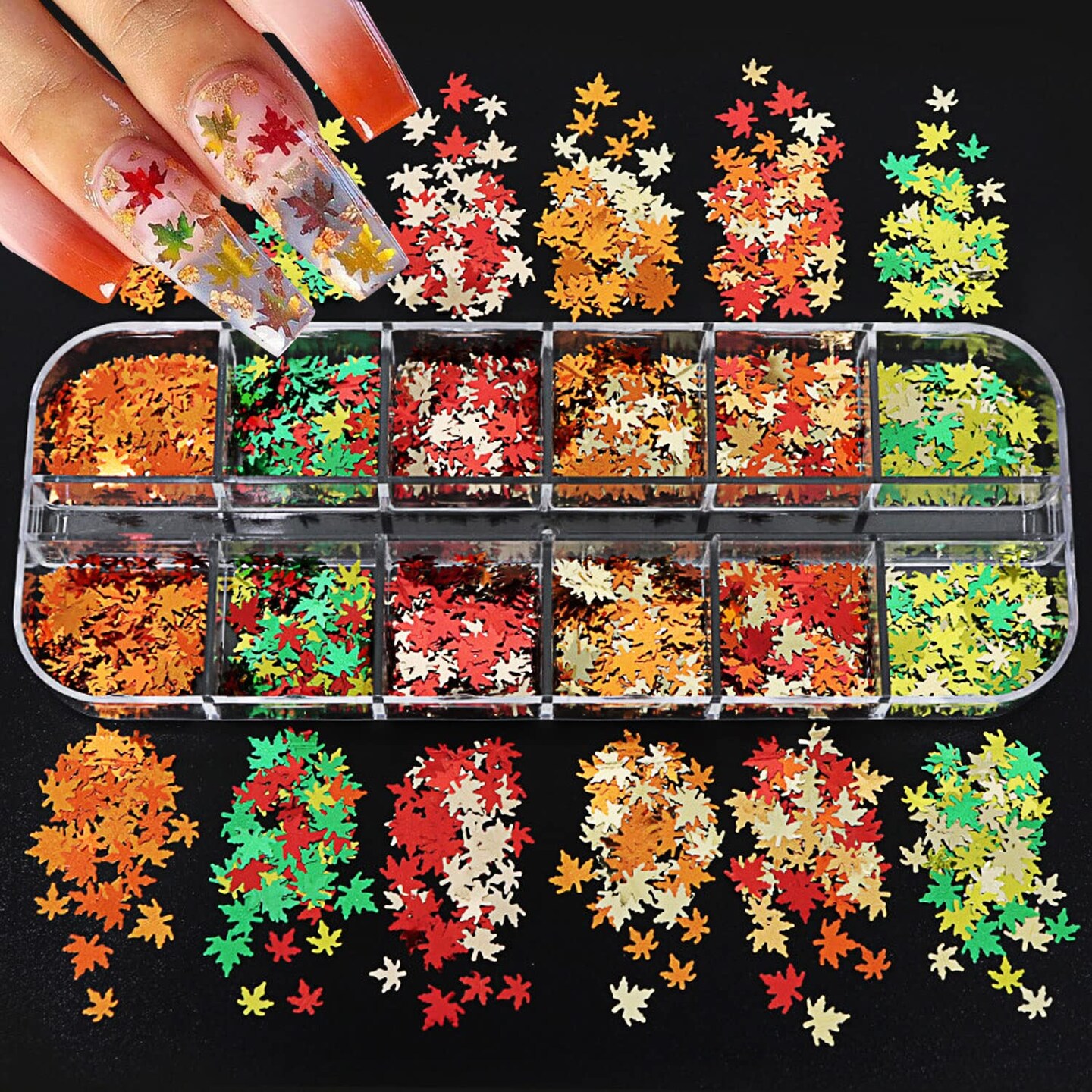 12 Grids Fall Maple Leaf Nail Art Glitter Sequins 3D Holographic(Gold, Red, Orange, Green, Yellow) 5.04 x 2.05 x 0.47 inches