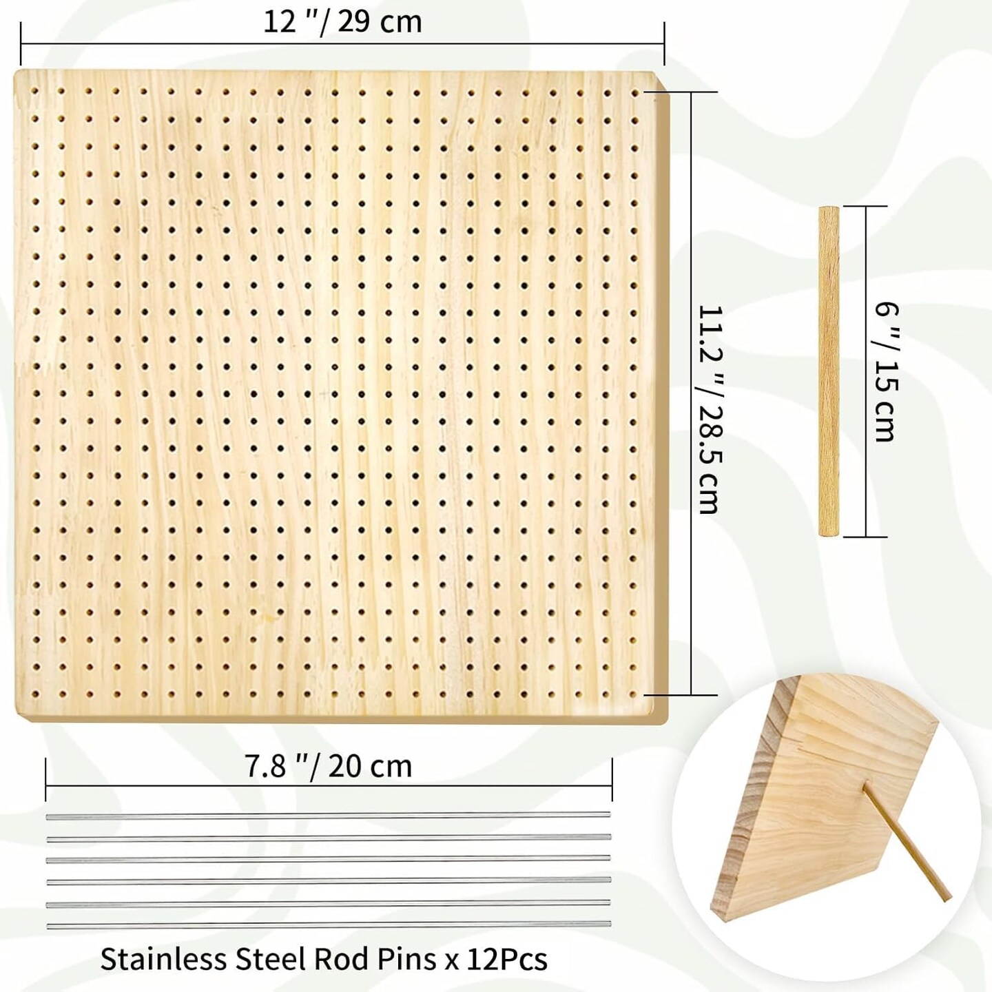 12 Inch Large Size Premium Wooden Crochet Blocking Board - Complete Crochet Accessories Set with 12 Steel Pins - Ideal for Knitting, Granny Squares, and Projects