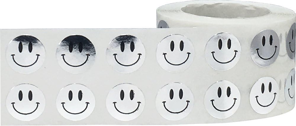 1/2" Inch Small Metallic Silver Happy Face Labels, 1,000 Total Adhesive Stickers on a Roll (Metallic Silver)