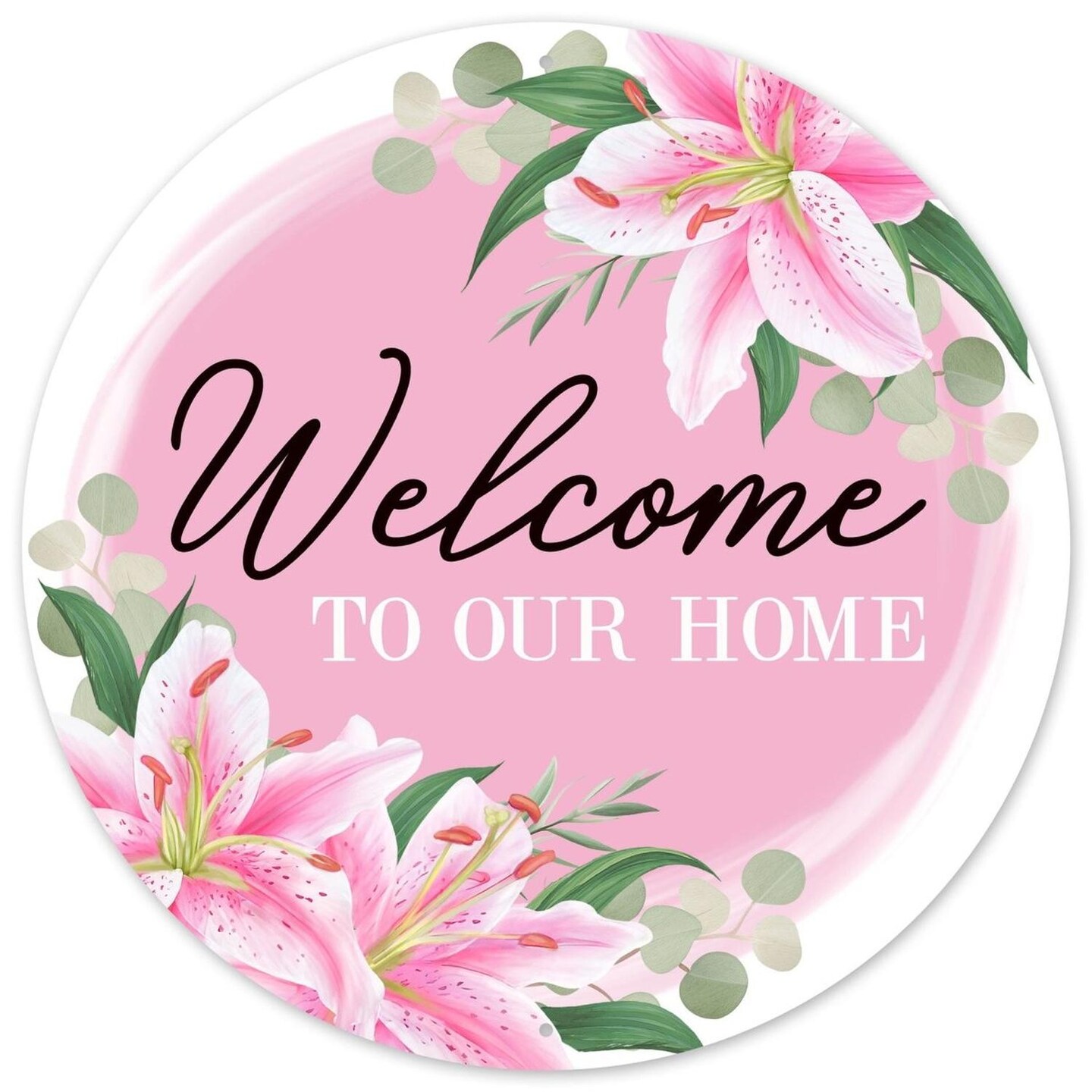 12" Metal Round Sign: Welcome To Our Home Lilies