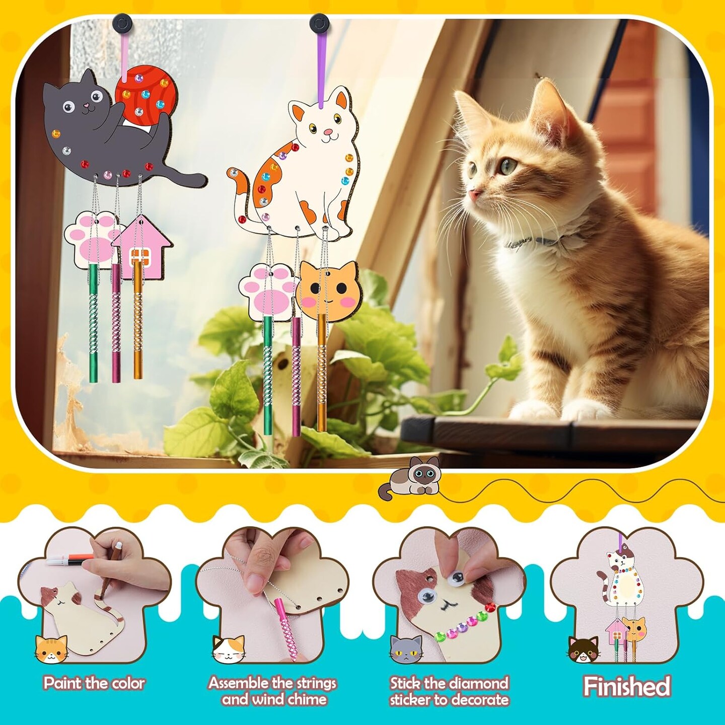 12 Pack Wind Chime Kit for Kids, for Girls Boys Home School Activity Party Supplies(Cute Cat)
