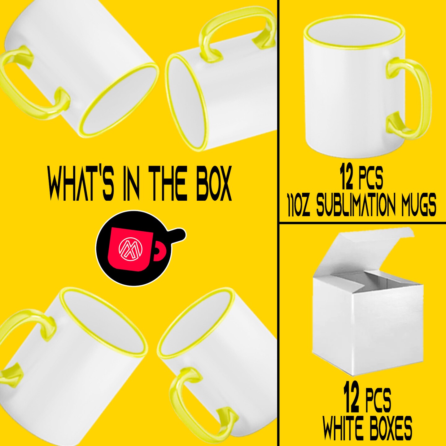 12 Pcs 11OZ Yellow Rim & Handle Sublimation Mugs With Individual White Boxes