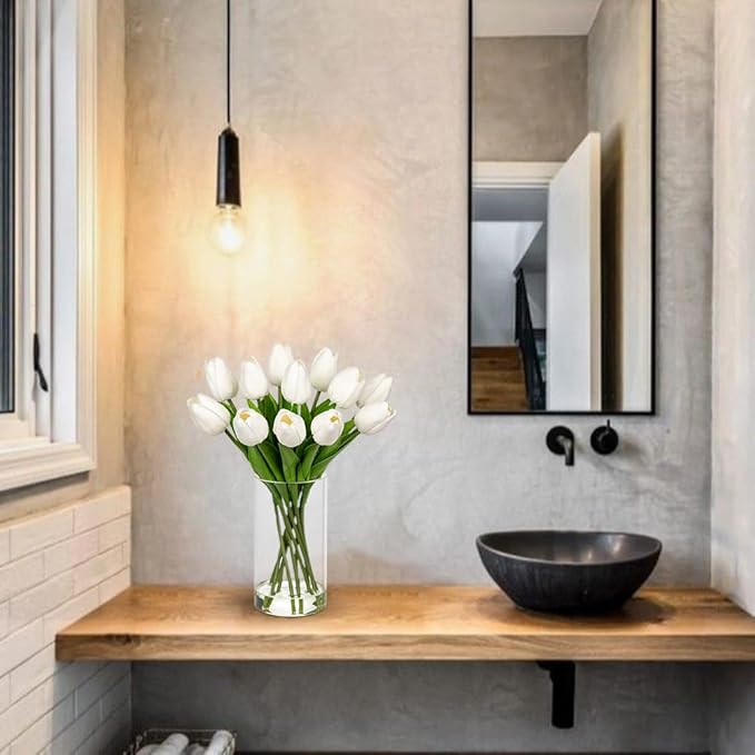 12 Pcs Artificial Real Touch Tulips in Glass Vase with Faux Water, White Tulip Fake Flower Arrangement for Dining Table, Home Decor, Wedding & Event Centerpieces