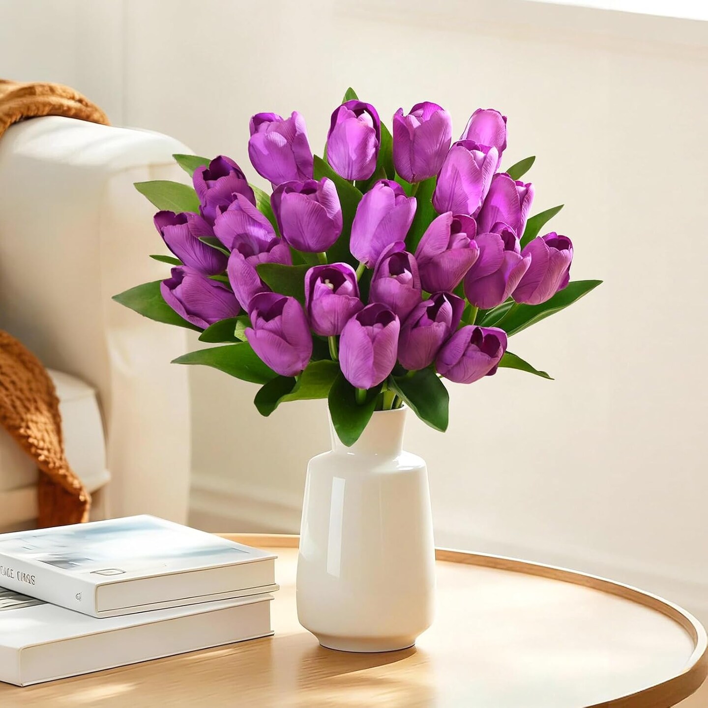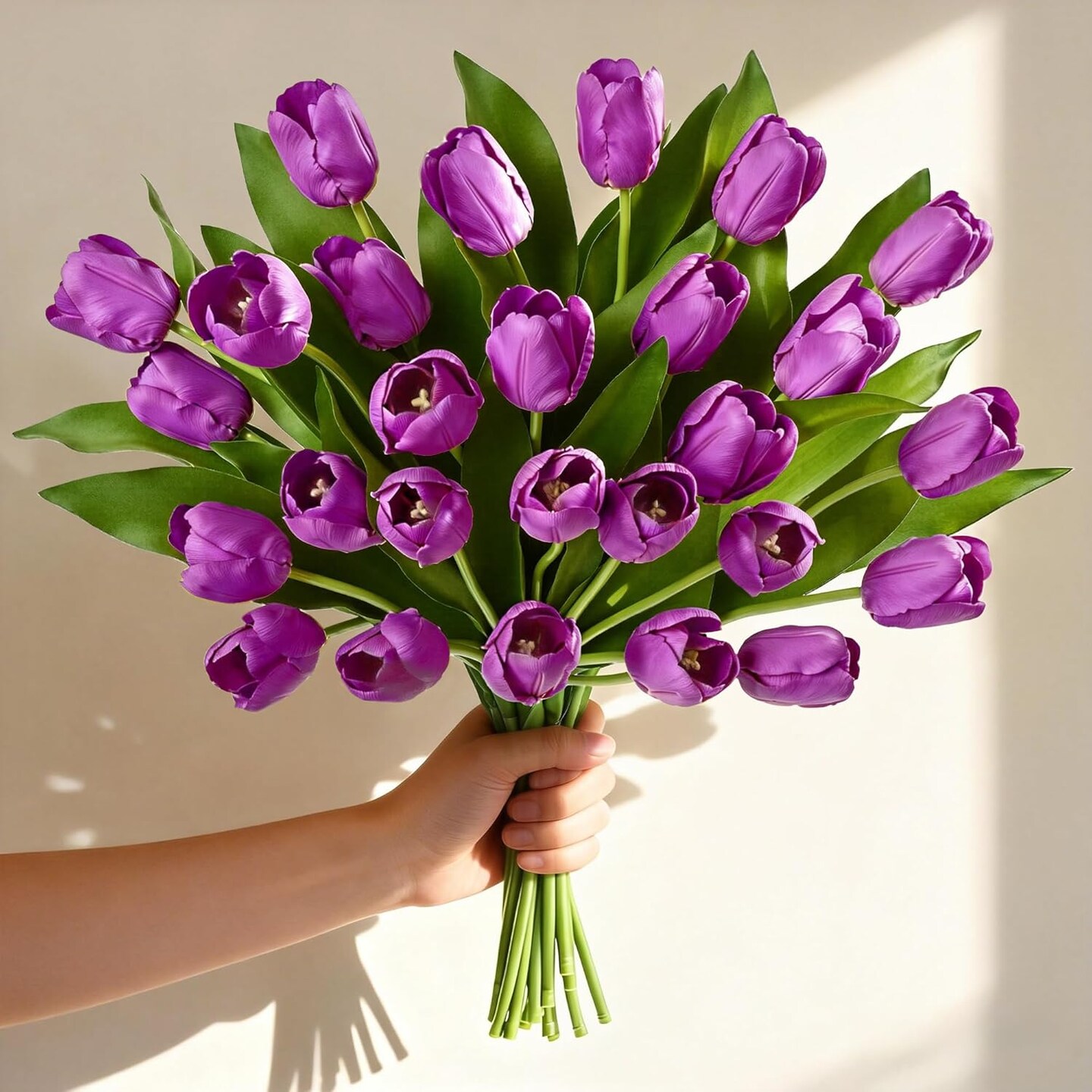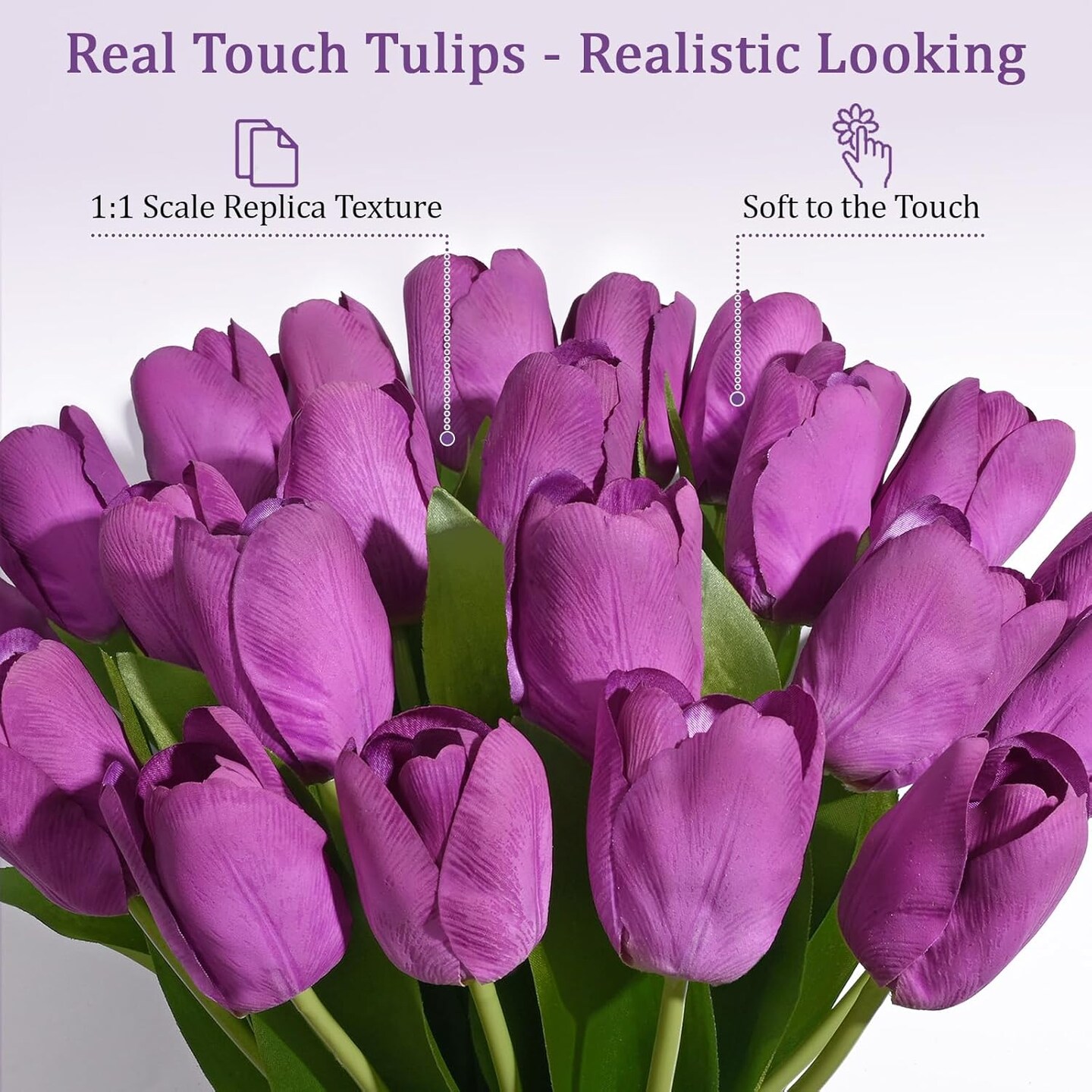 12 Pcs Purple Real Touch Tulips – Artificial Faux Flowers for Wedding, Spring Bouquets, Home Décor, Tables & Party Centerpieces (14 Inch)