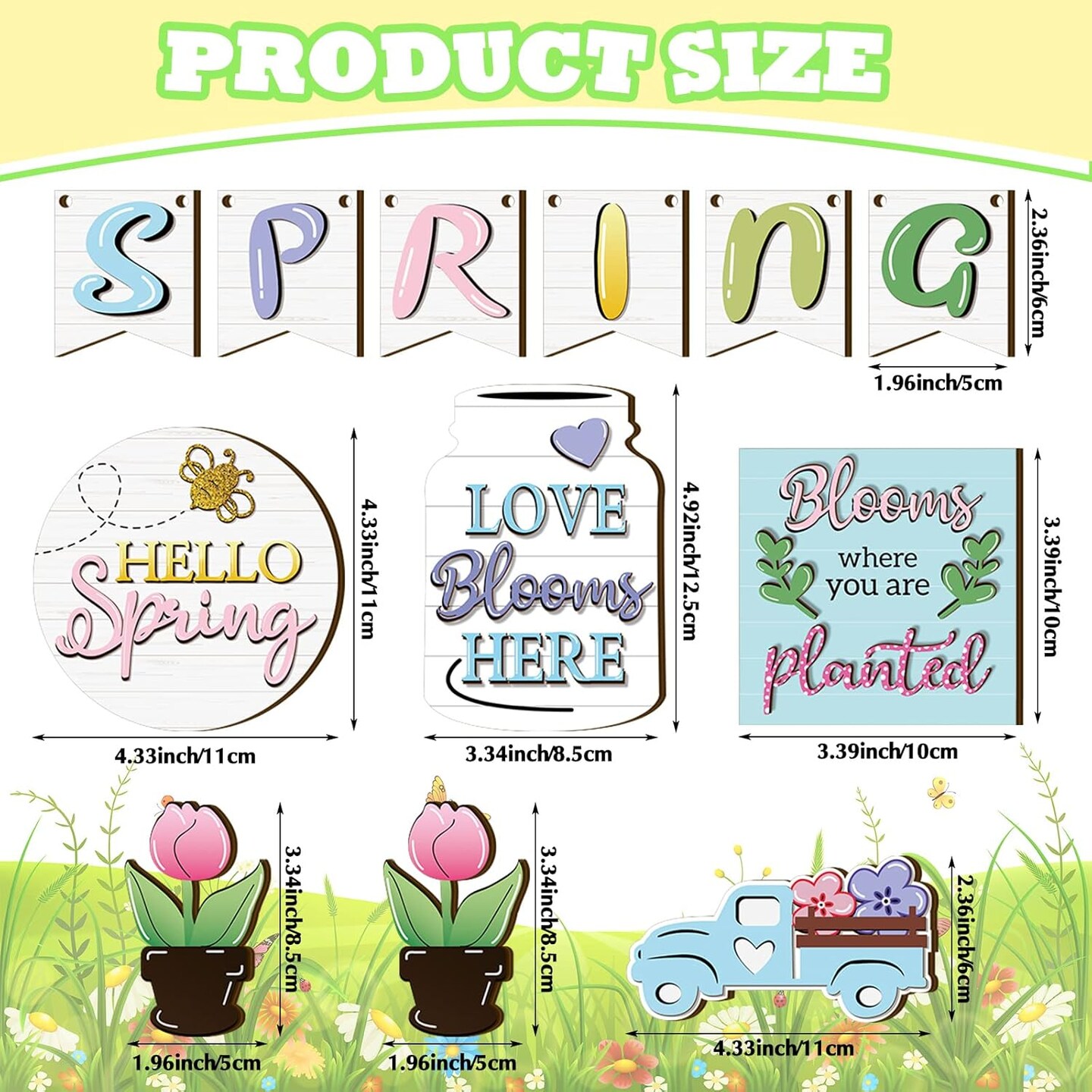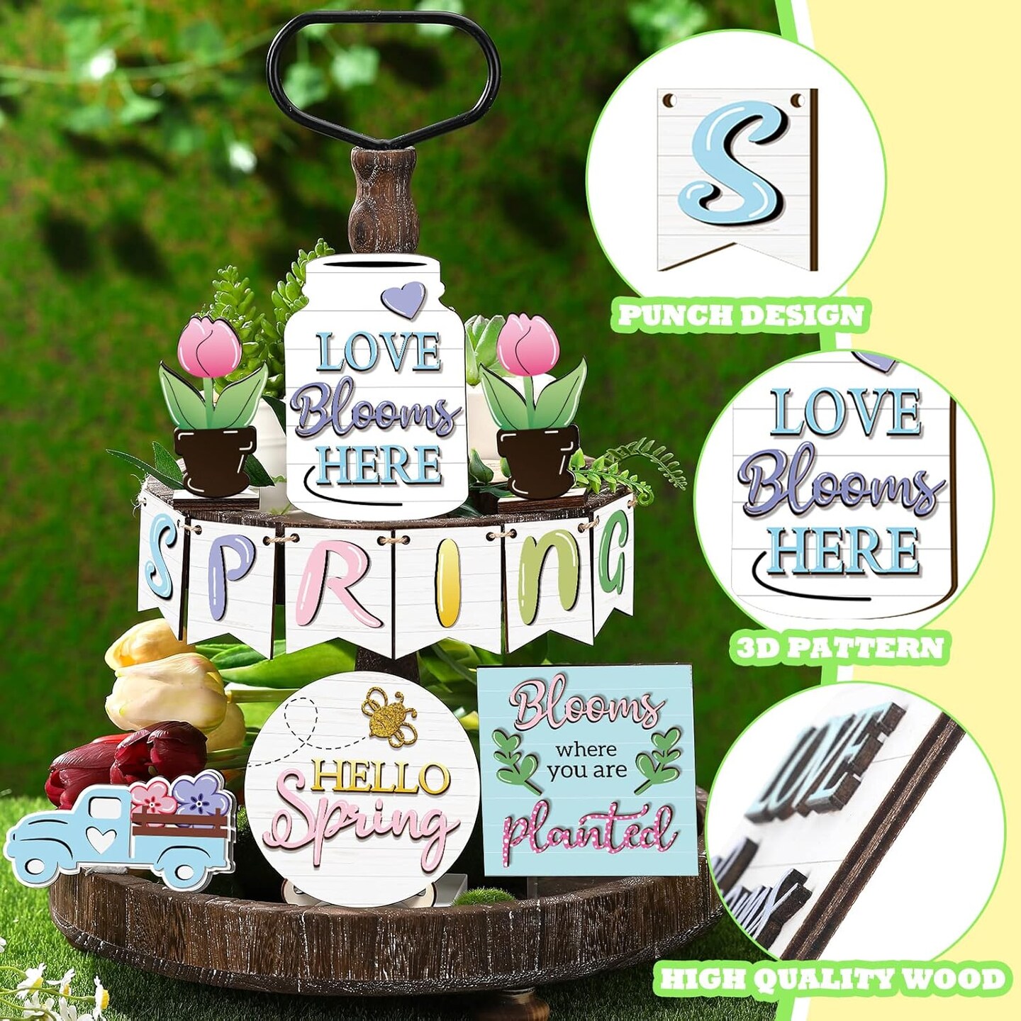 12 Pcs Spring Tray Decor Set Hello Spring Decor Wooden Truck Tulip Flower Table Signs Rustic Farmhouse Spring Decorations for Home Kitchen Tabletop Holiday Party Decor