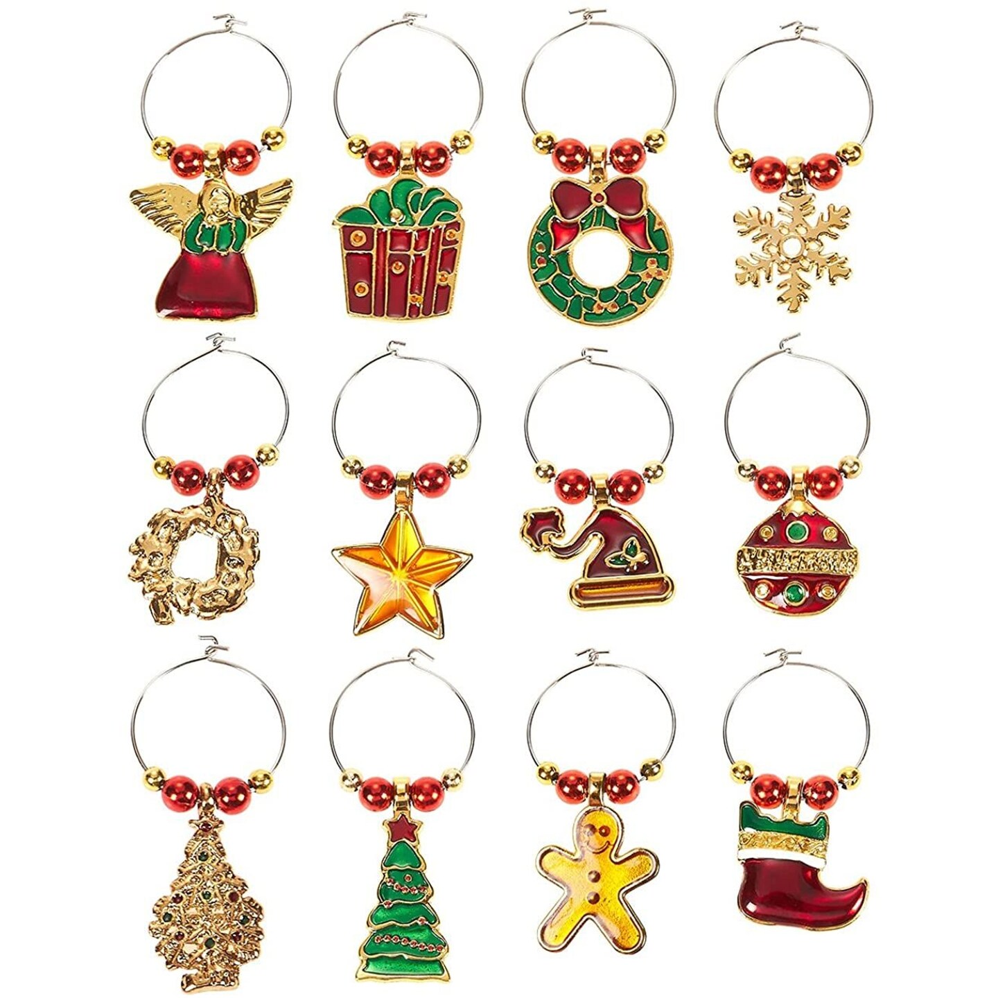 12 Piece Christmas Wine Glass Charms, Holiday Drink Markers Set (2 Inches)