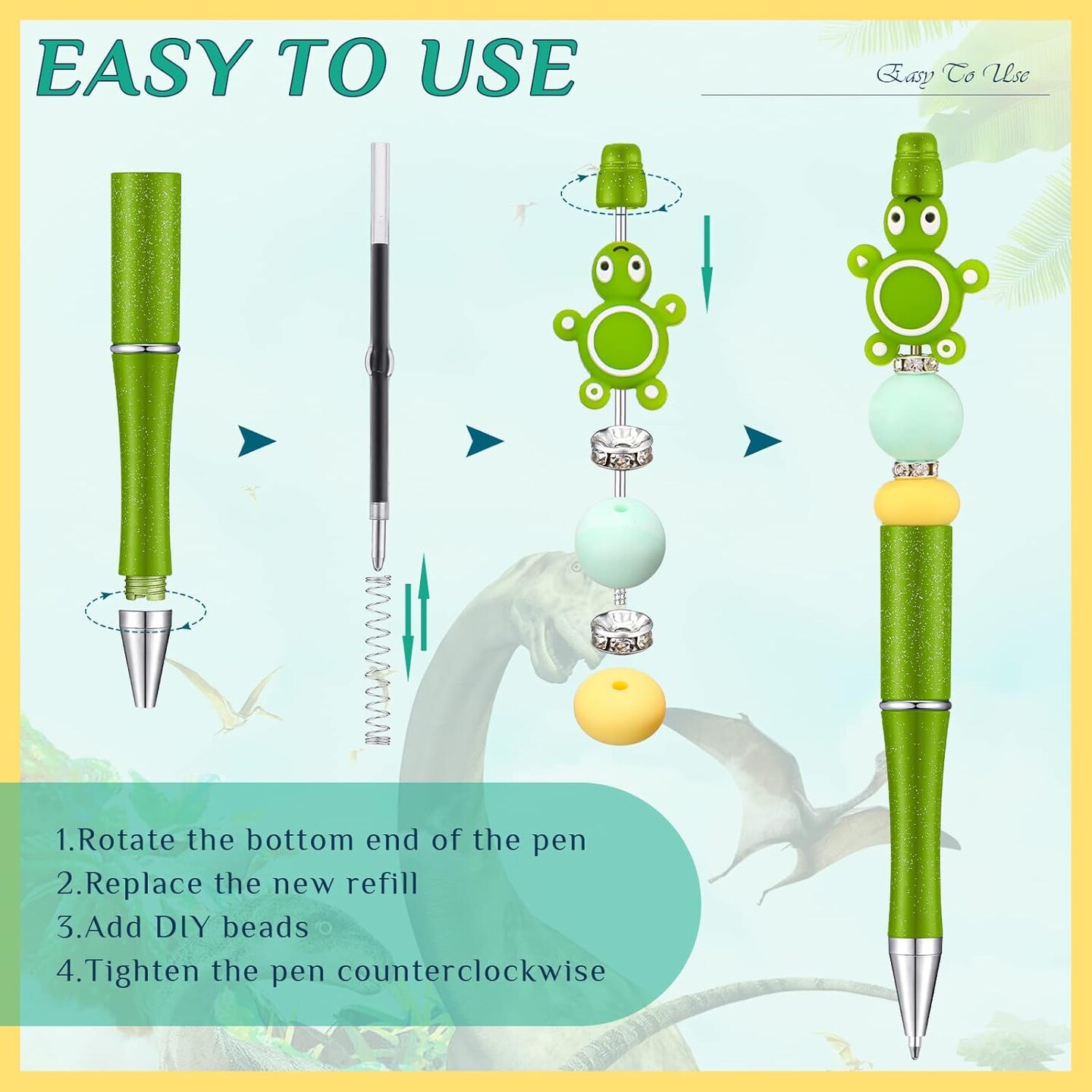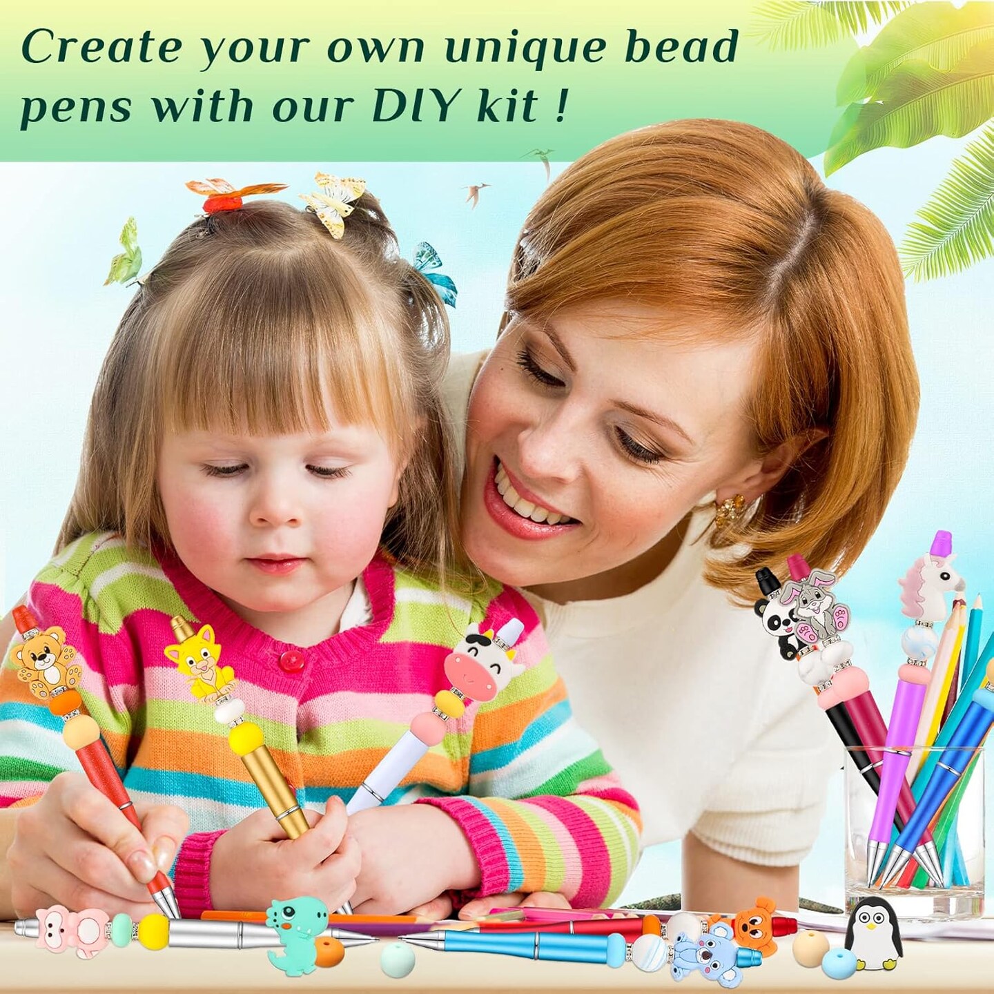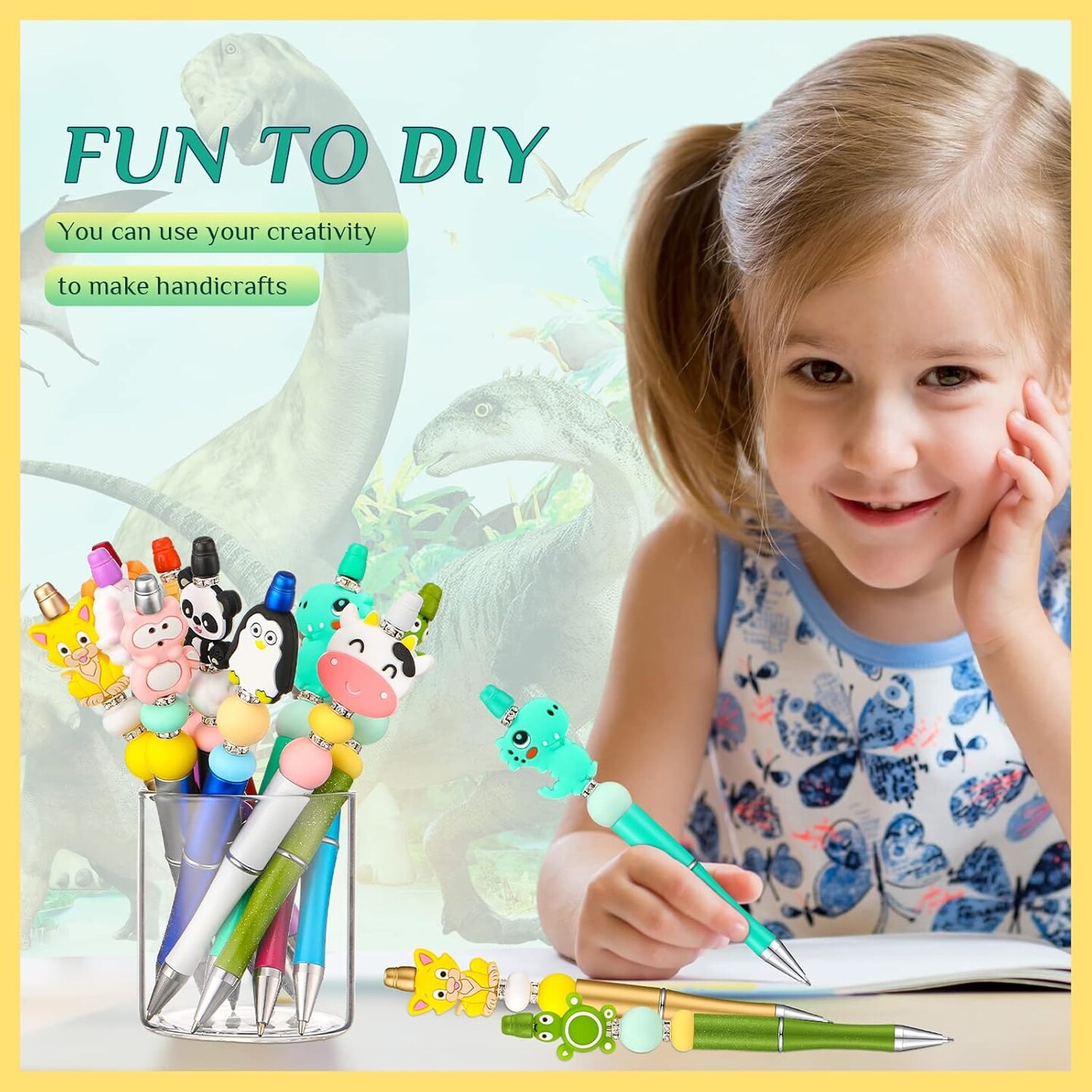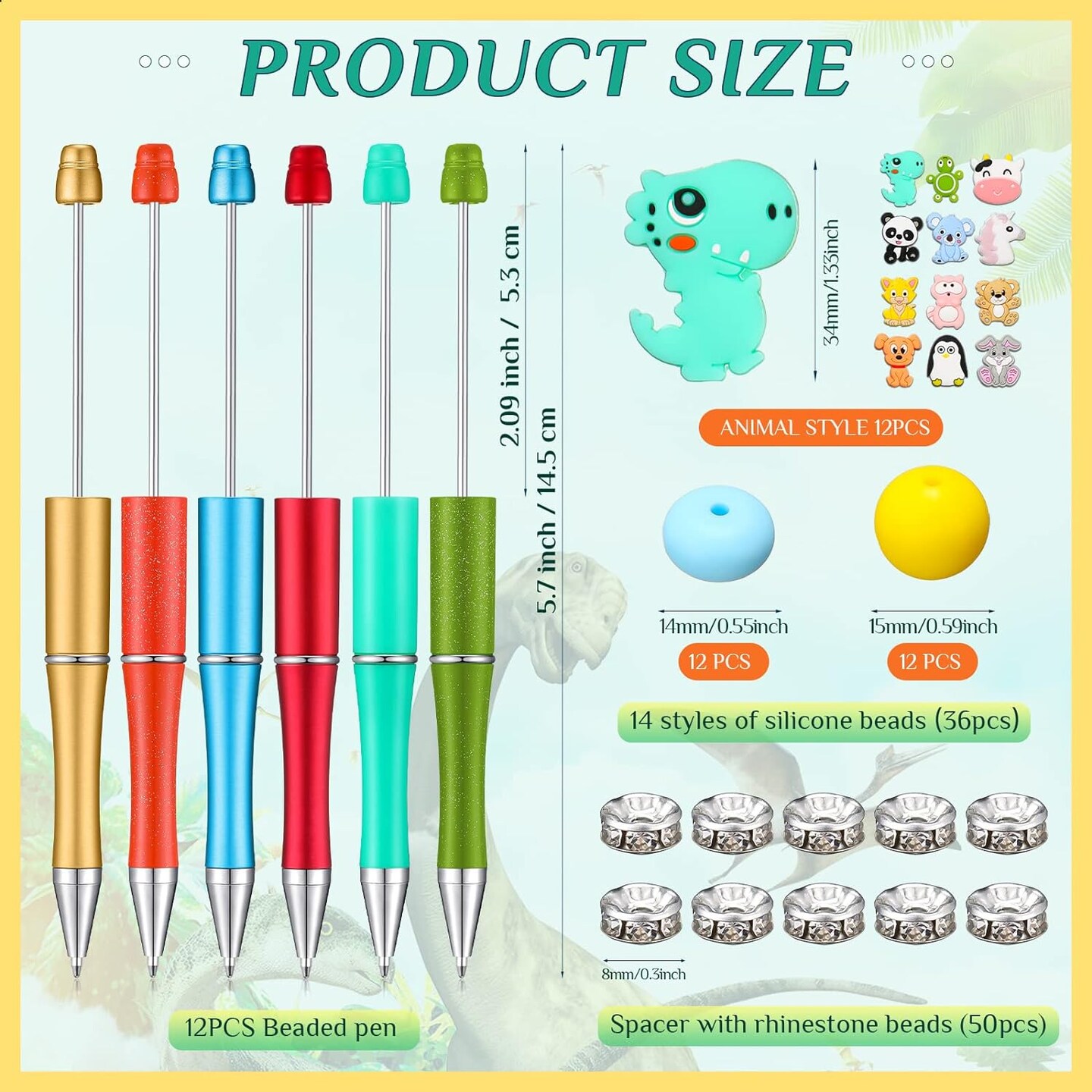 12 Pieces Beadable Pens Kit with Silicone Focal Beads, Animal Style, Black Ink, for DIY School Supplies