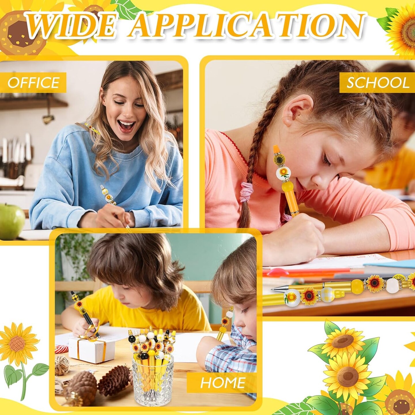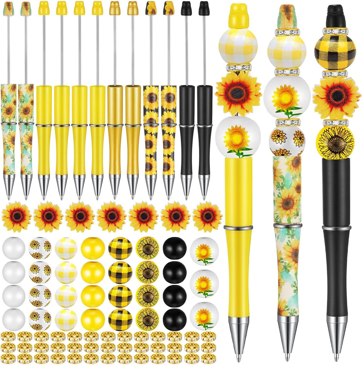 12 Set Beadable Pens DIY Kit - Assorted Beads, Black Ink, Sunflower Design