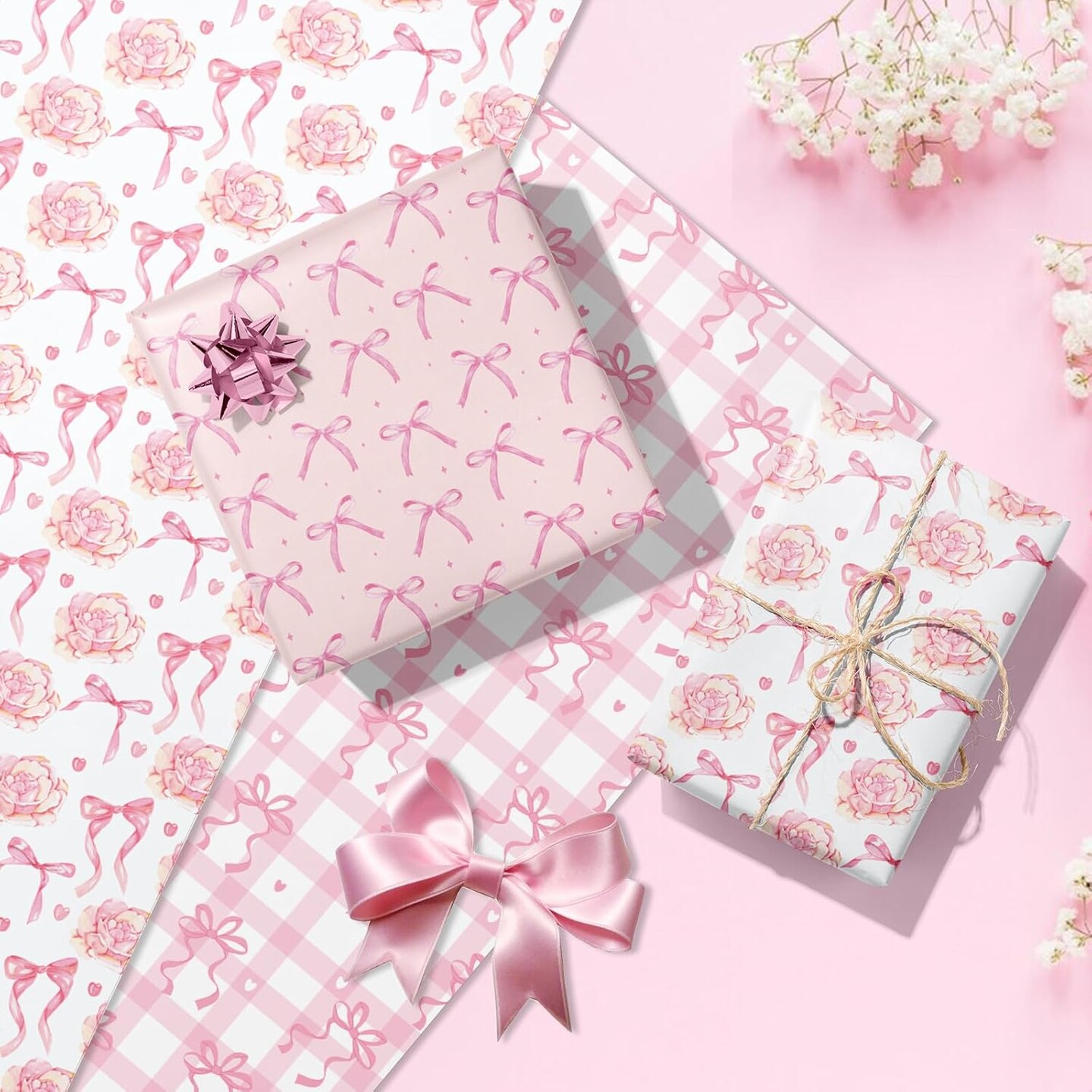 12 Sheets Pink Bow Wrapping Paper – Floral, Plaid, Heart & Bow Designs, Folded Flat Craft Paper for Valentine’s Day, Wedding, Baby Shower, Birthday (Pink Bow) 19.7 x 27.6 Inch