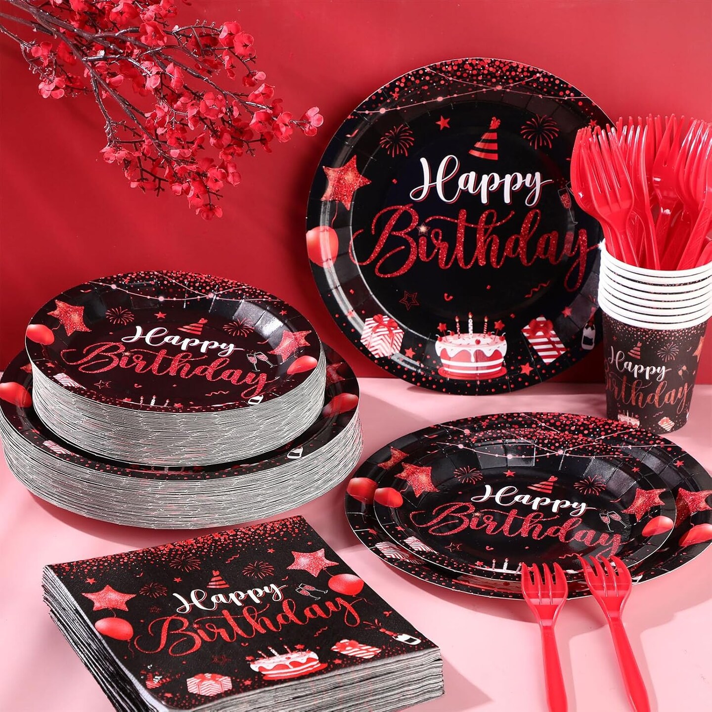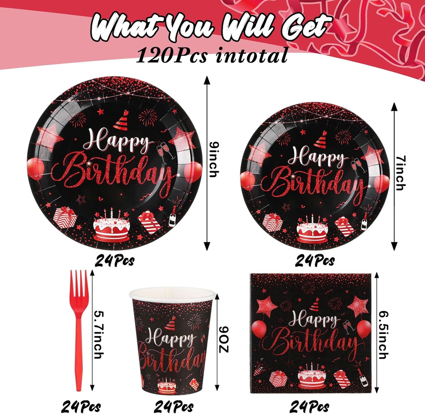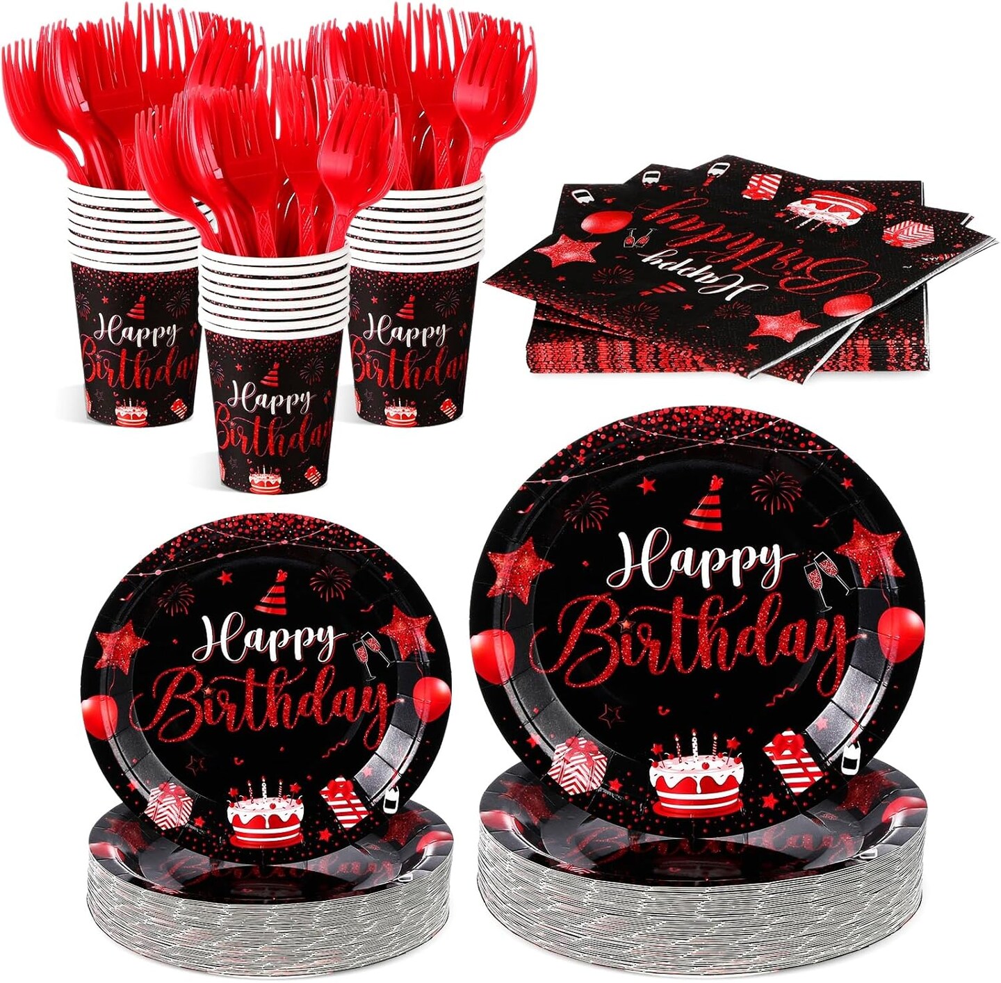 120 Pcs Happy Birthday Party Supplies Disposable Party Tableware Serves 24 Included 7 Inch 9 Inch Plates Napkins Cups Forks for Men Woman 50th Birthday Party Decorations (Black and Red)