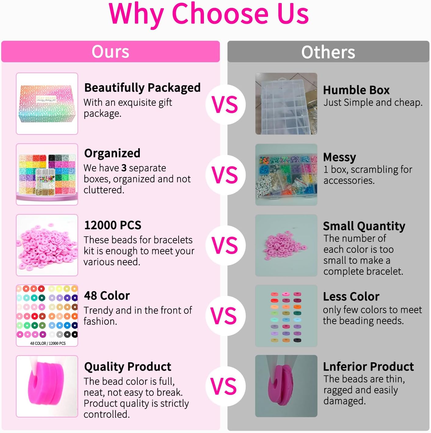 12000 Pcs Clay Beads, 48 Colors in 3 Boxes, Friendship Bracelet Kit with Elastic Strings, Polymer Spacer Beads, Jewelry Making Crafts