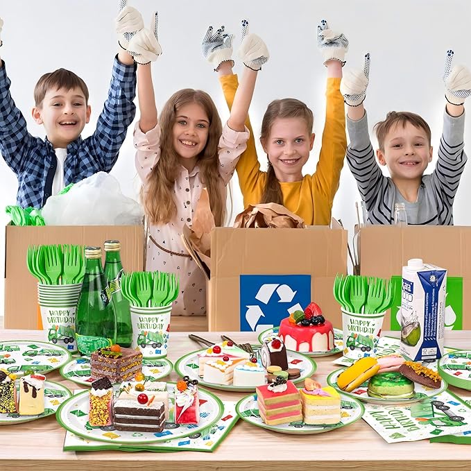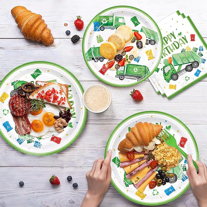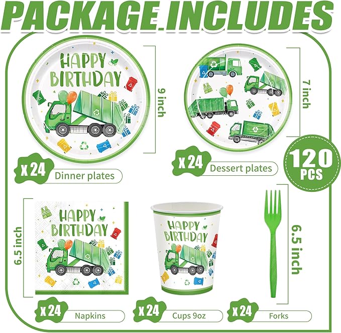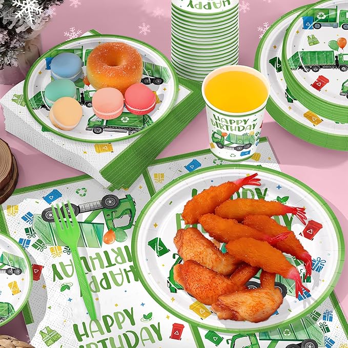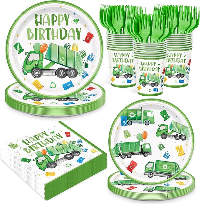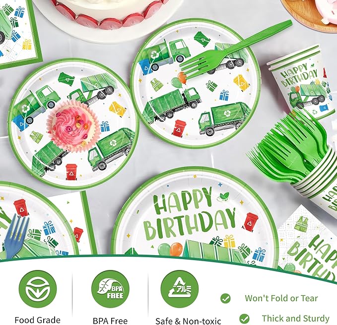 120pcs Garbage Truck Birthday Party Decorations Trash Truck Plates Napkins Green Forks Disposable Tableware Set Waste Management Recycling Rubbish Truck Birthday Party Supplies Serve 24 Guests