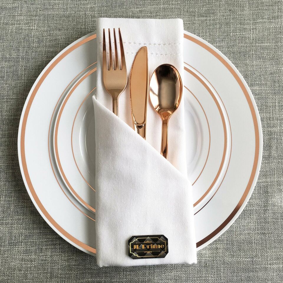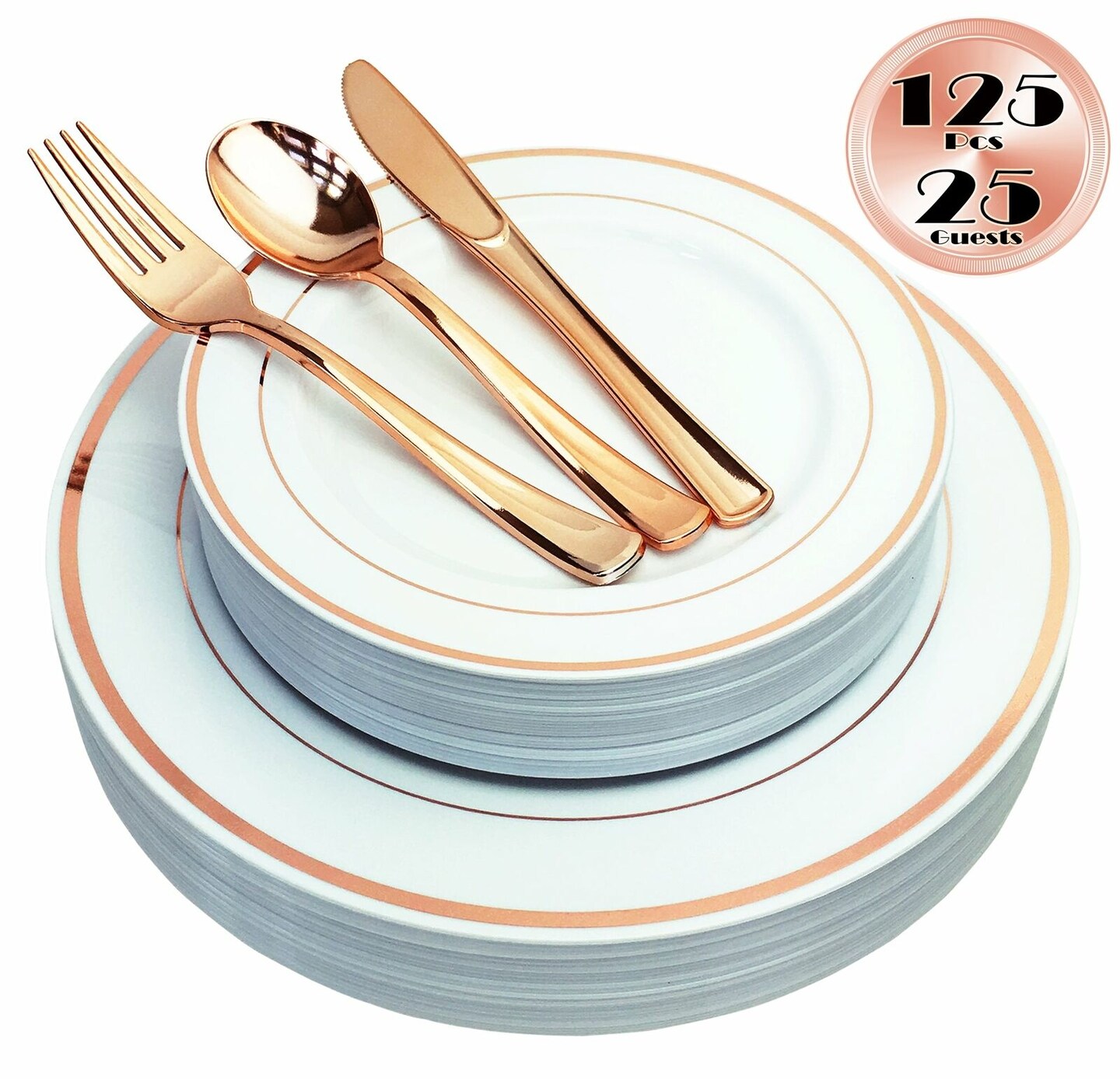 125 Piece Rose Gold Plastic Plates & Cutlery Set, Heavy Duty Disposable