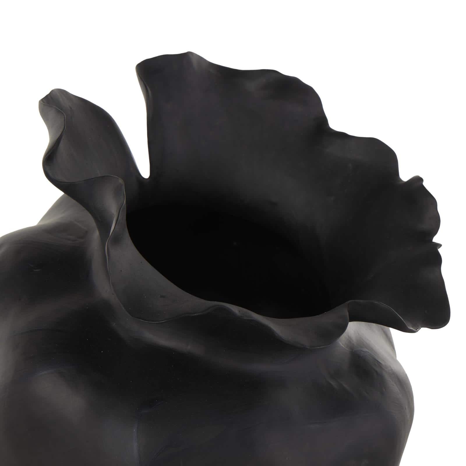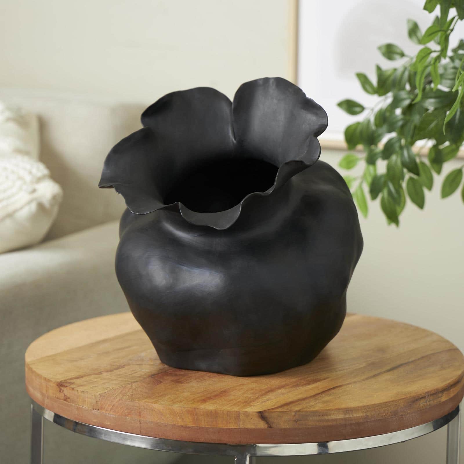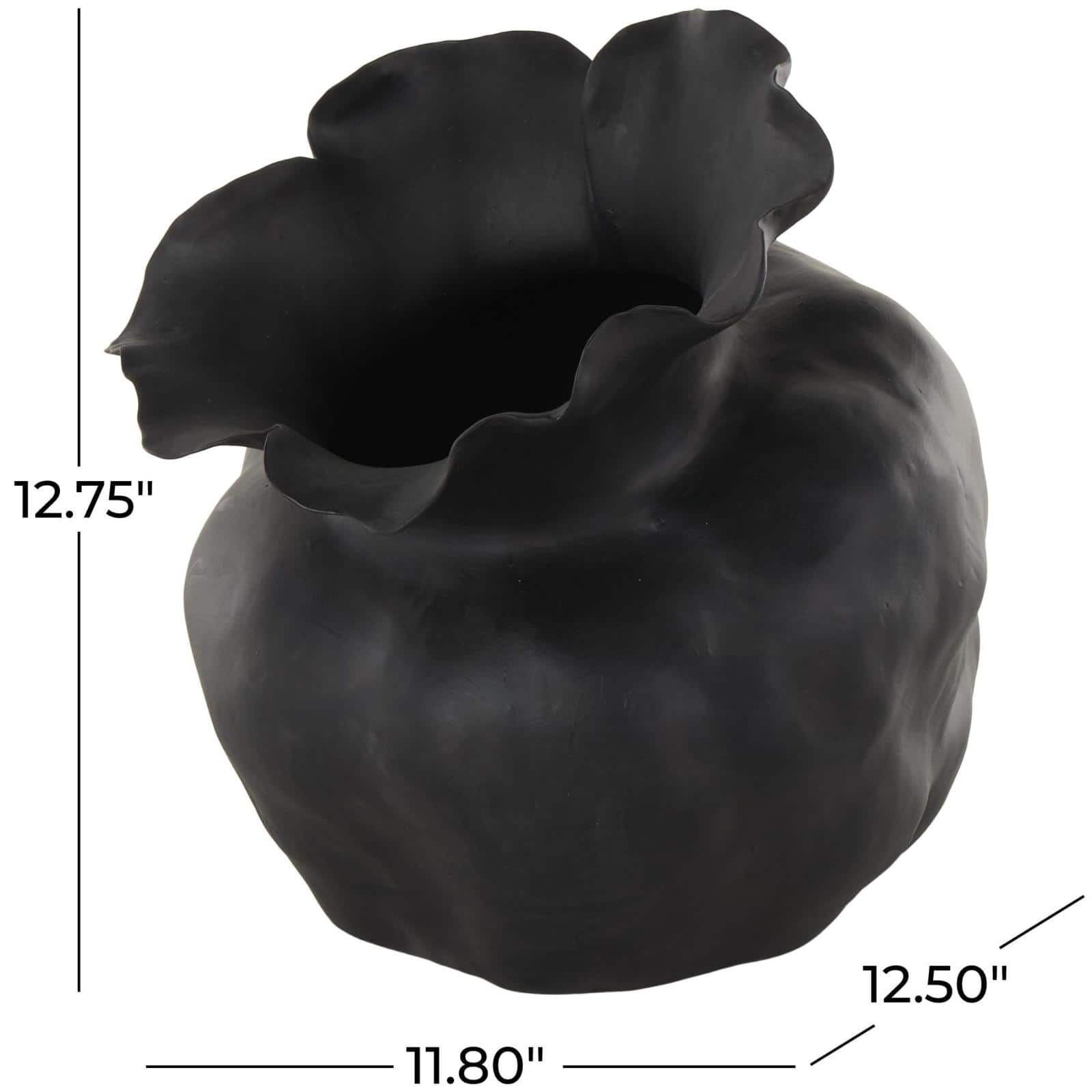 12.75" Black Ceramic Abstract Wide Rounded Floral Shaped Decorative Vase with Petal Rim