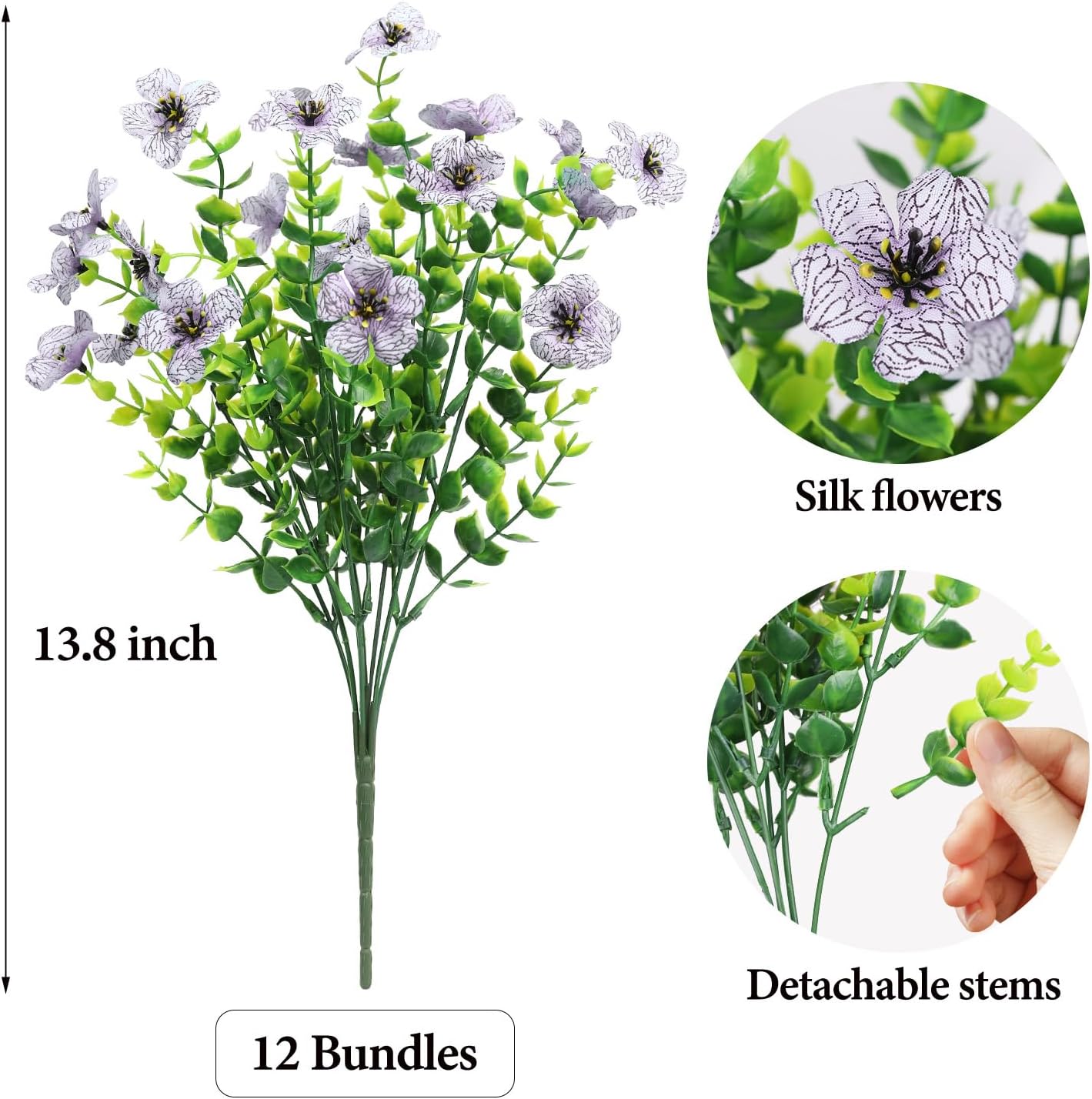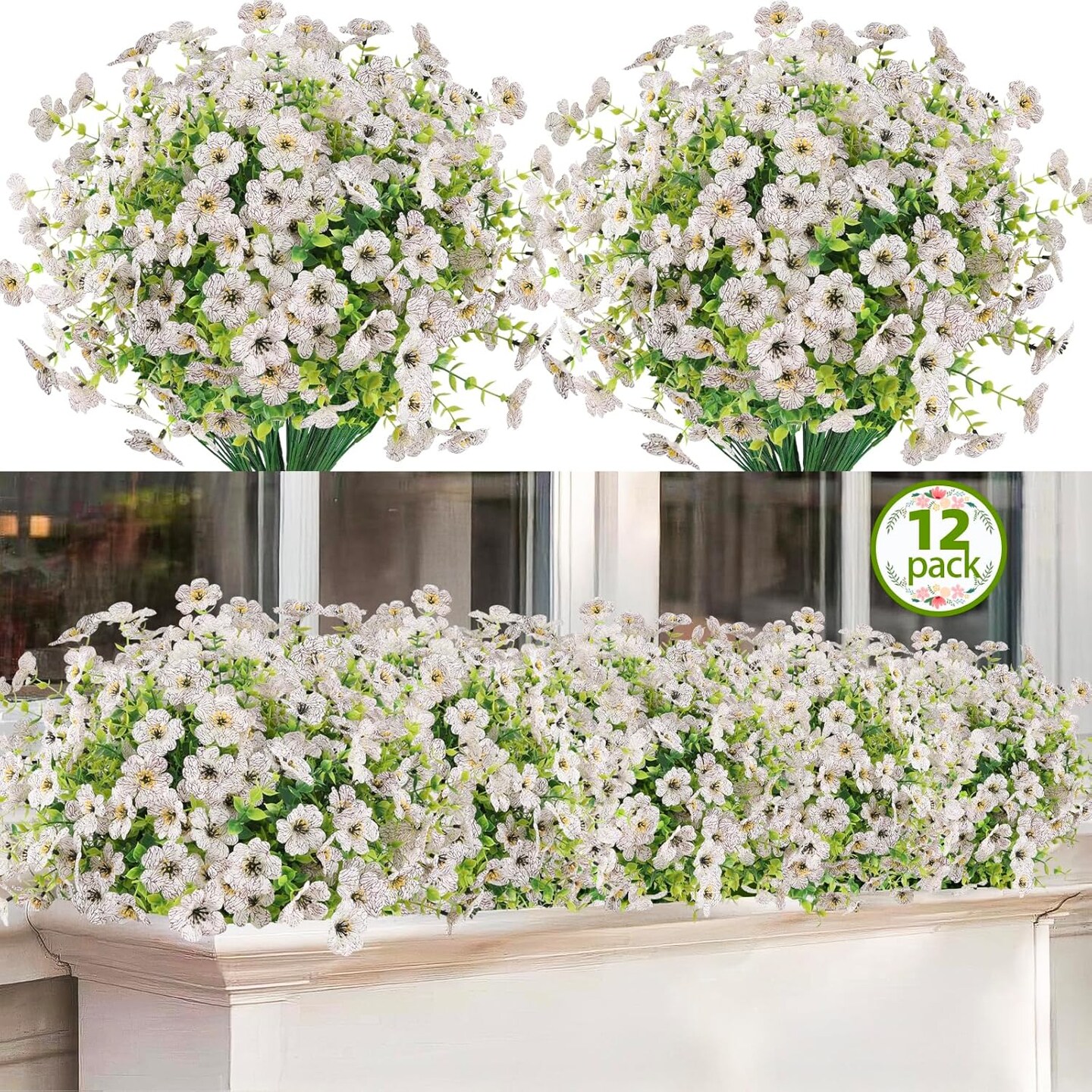 12-Bundle Artificial Outdoor Flower Set UV Resistant Faux Plants and Greenery for Spring Garden, Hanging Planters, Patio, Home, and Vase Decor (White)