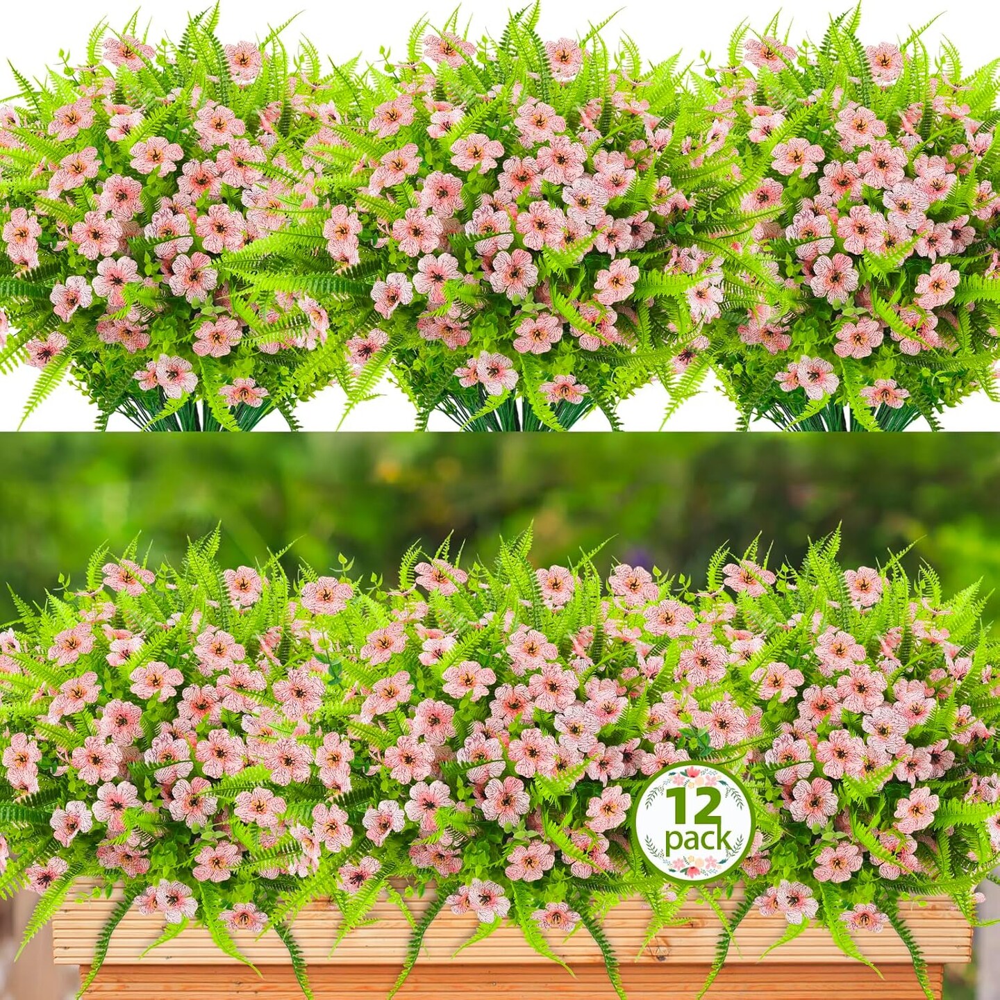 12-Bundle Artificial Outdoor Flower Set – UV-Resistant Faux Ferns and Greenery for Spring, Garden, Hanging Planters, Home, and Vase Decor (Pink)