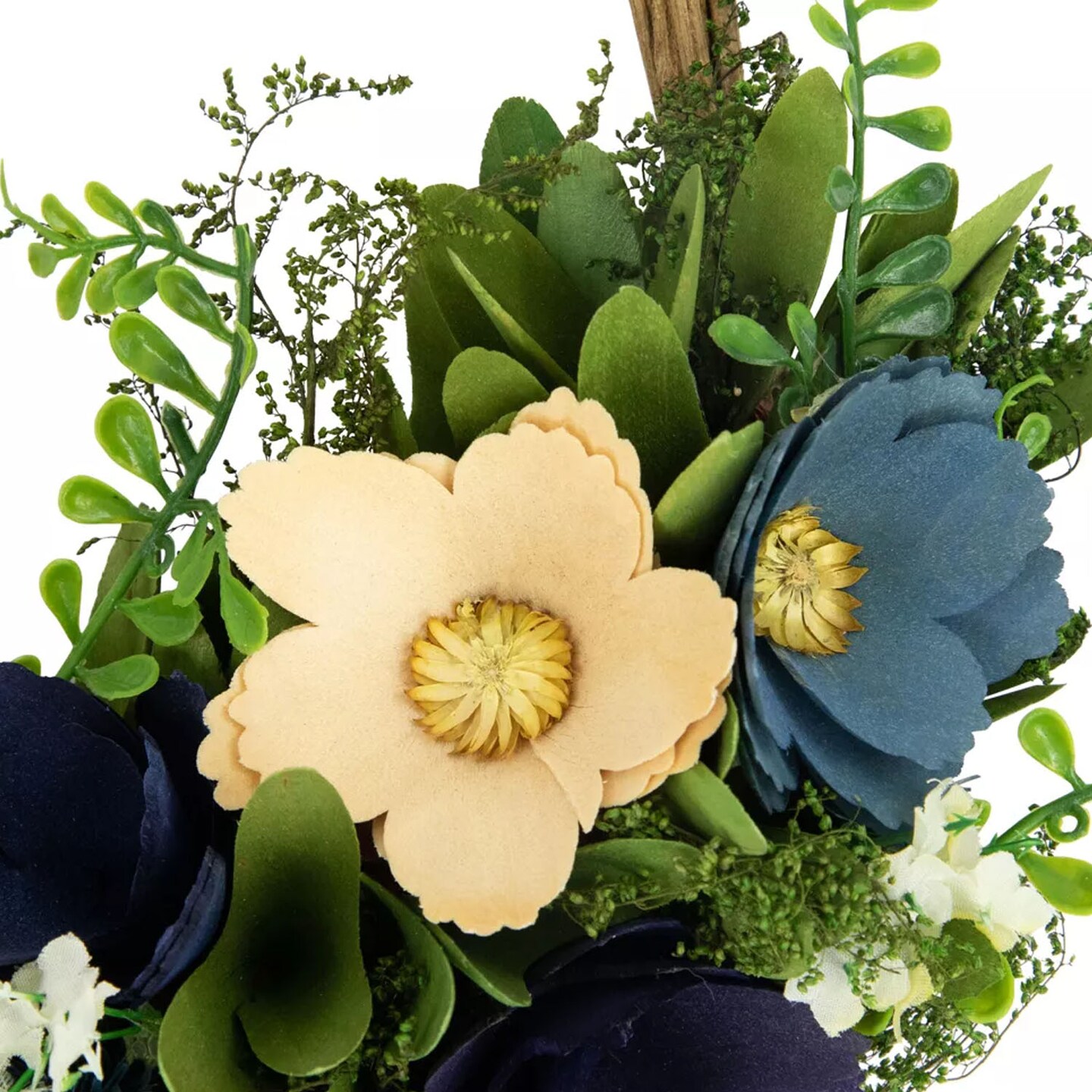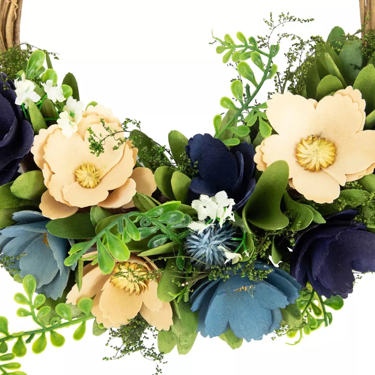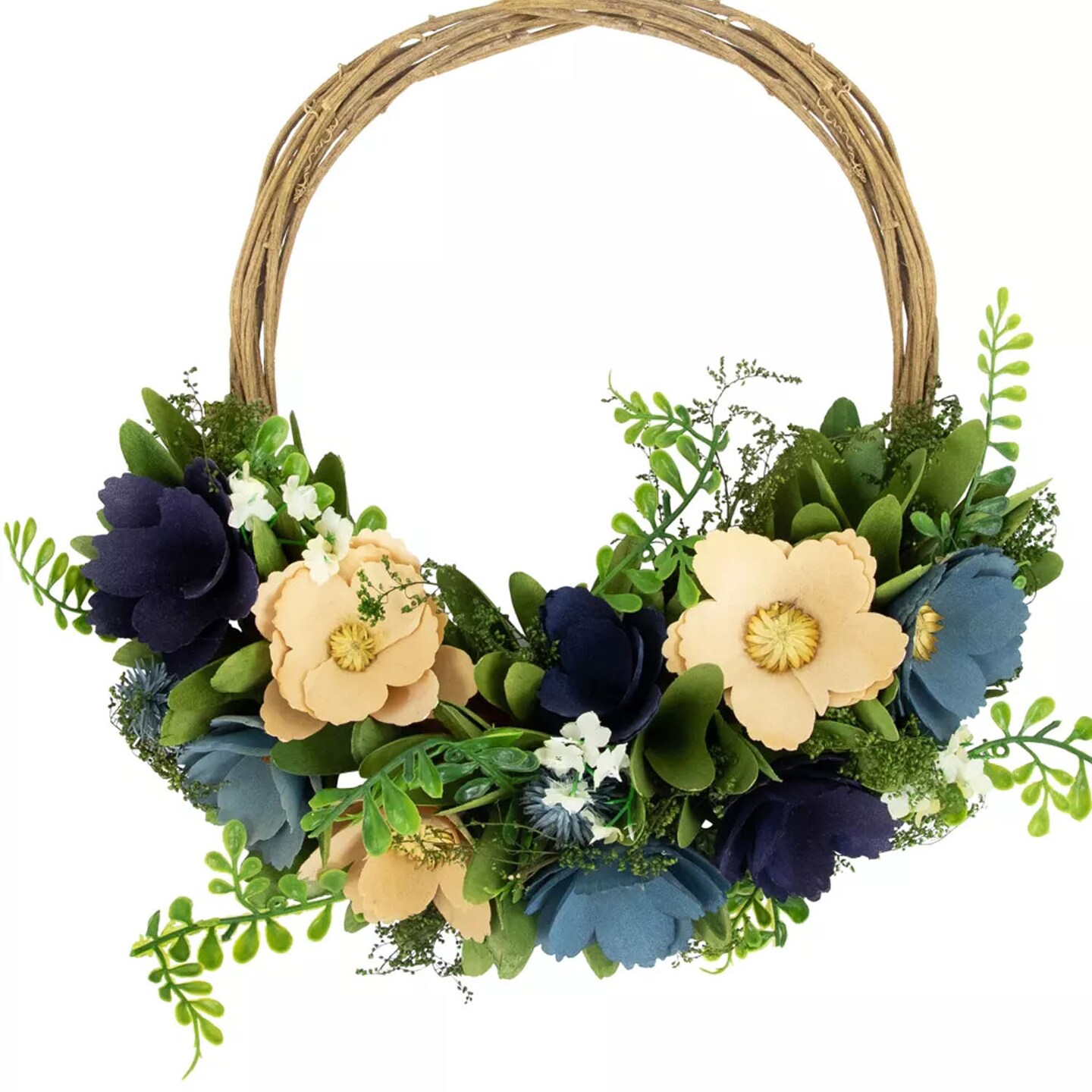 12-Inch Blue and Tan Poppy Floral Wooden Basket Wreath Rustic Spring Wall Decor